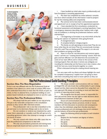1. We always hold the pet’s welfare as our top priority. The pet is the vulnerable component in the consultation process as they cannot offer informed consent. 2. The professionals’ role is one that is beneficial to the pet and never to its detriment. Always seek to do no harm. 3. Do not condone or endorse any treatment by a pet’s owner that is physically or mentally cruel. We will opt out of a consulting agreement rather than attempt to manage an unethical course of action. 4. We only consult with clients who offer cases that we have the professional competence to deal with. 5. We only use procedures, protocols and training tools that are empirically based and have a proven track record. 60