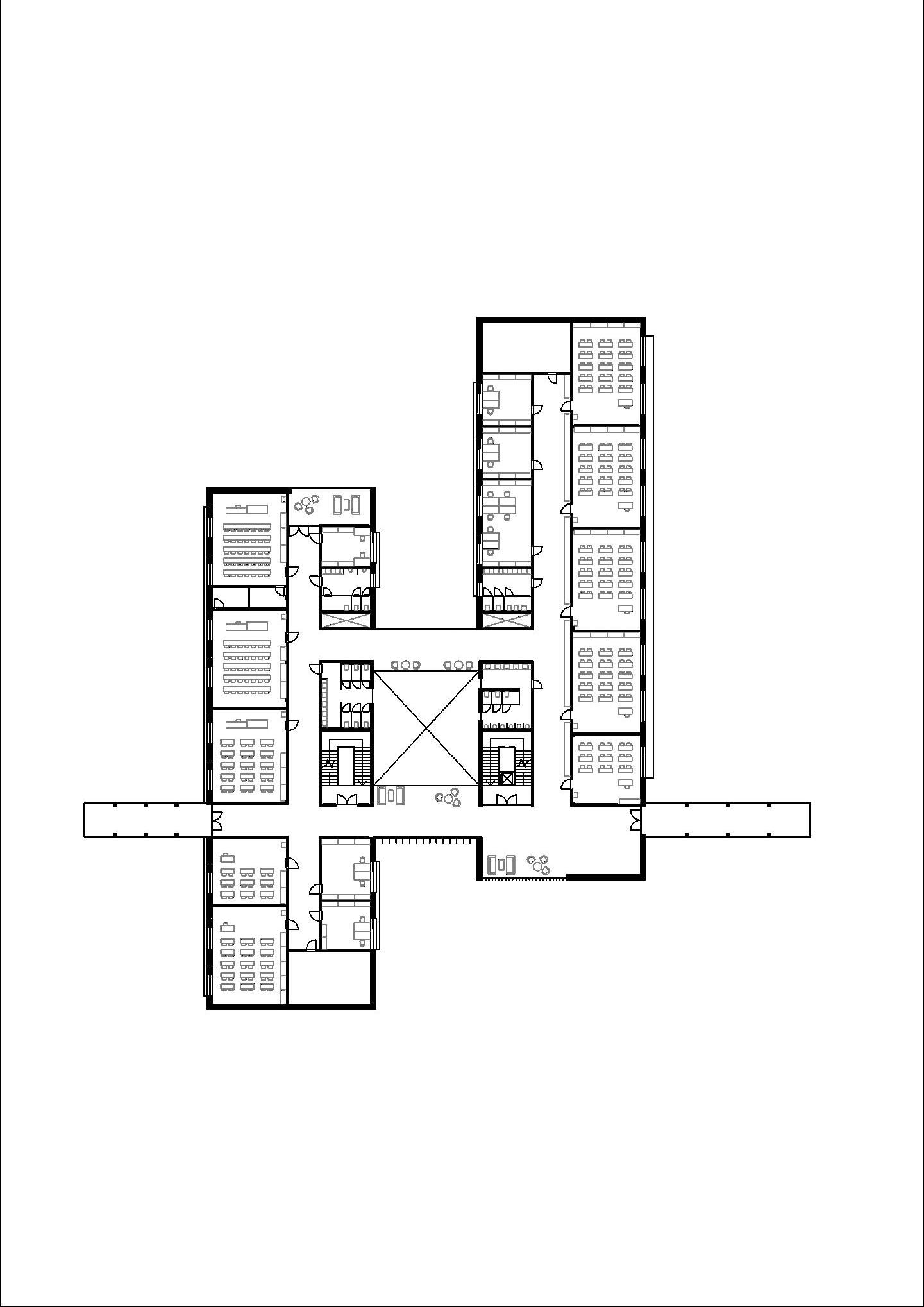 The vertical spacing of longitudinal facades relates to surrounding buildings and makes the school looks higher. Frontal facades on the other hand are created with more dynamics. Glazed atrium shows horizontal footbridges to oppose the verticality of solid blocks.