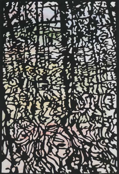 Farbe schleicht sich in die Schnitte und diese sich in die Malerei. Schablonen werden zu Ebenen, Durchblicke sind erlaubt. Möglichkeitsräume tun sich auf und in der Übernahme des zunächst Fremden klärt sich die eigene Ausdrucksweise.
