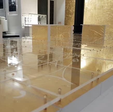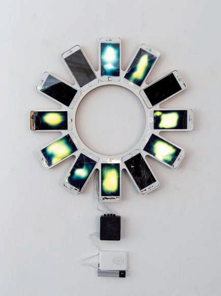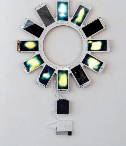 © Friedrich Boell: »Ladebalken I«, 2022, iPhone-Bildschirme, MDF, Leiterplatte und Mikrocontroller. Foto: © Thomas Lambertz