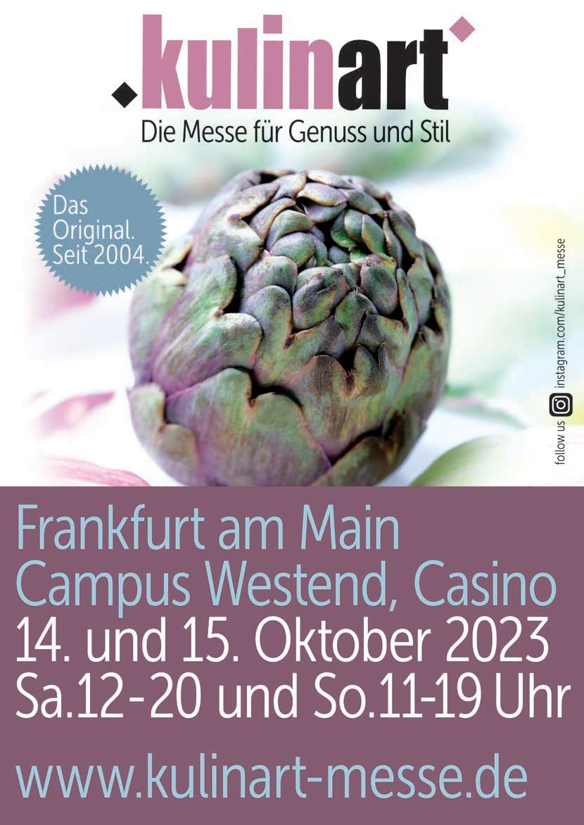 Drei lange Jahre mussten Genießer auf ihre Stamm-Messe „kulinart“ verzichten. Jetzt gibt es Mitte Oktober zwei Tage lang im Casinogebäude am Campus Westend Frankfurt wieder einiges zu entdecken, zu verkosten und mit nach Hause zu nehmen. (S. 6) Ebenfalls in Frankfurt findet im November die älteste Whiskymesse Deutschlands statt und lockt mit spannenden Ausstellern, einem vielfältigen Weiterbildungsprogramm und natürlich mit Whiskygenuss der Extraklasse (S. 8).