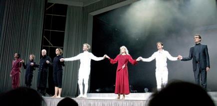 Die dritte Darmstadt-Produktion des versierten Duos Franziska Angerer (Regie) und Carolin Müller-Dohle (Dramaturgie) ist ein rares Gesamtkunstwerk, das lange nachhallt. Rund 1000 Meter rote Stoffbahnen werden auf offener Bühne zum Schicksalsgeflecht wie von den Nornen verwoben.