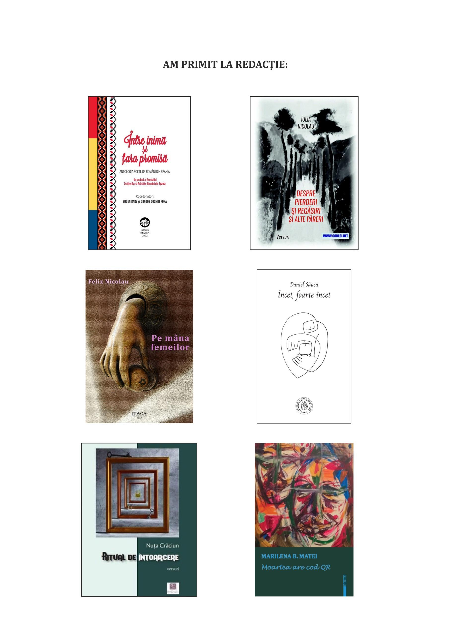 terpreți muzicali sau compozitori, actori sau regizorietc.,pecarelumeacultural-literarădin România mi-ar plăcea să-i cunoască. Spre exemplu, în orașul Parla – Madrid unde locuiesc, funcționează un cenaclu literar, care se numește ASARS (Asociația Scriitorilor și Artiștilor Români din Spania), şi care își desfășoară activitatea în spațiul Centrului Cultural „Antim Ivireanul”, de pe lângă Parohia Ortodoxă RomânăSfântaAnastasiaRomanadinParla–Madrid,alcăruiparohsunt.Laacestcenacluneîntâlnimiubitoriailiteraturiișiculturiiromâneși spaniole. Aceștia au fost publicați, de la înființarea acestui cenaclu și până acum, în diferite revisteimportantedinRomânia,dinSpaniasau dinaltețări.Peaceștiavremsă-ipromovăm(și, parcurgândpaginilerevisteinoastre,vețifiplăcut surprinși de talentul și hărnicia lor), dar și pe cei din alte cenacluri, care sunt creatori autentici. Mulți au publicat unul sau mai multe volumedepoeziisauproză,câțivadintreeidevenind între timp membri ai Uniunii ScriitorilordinRomânia.
