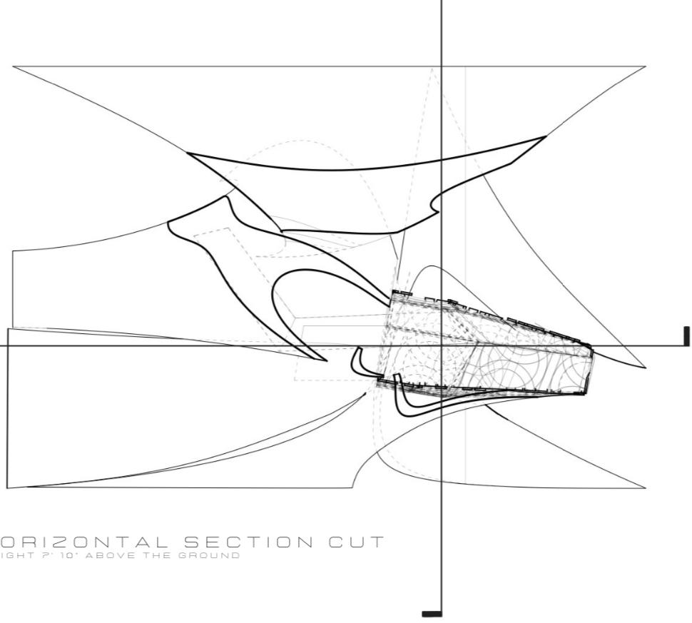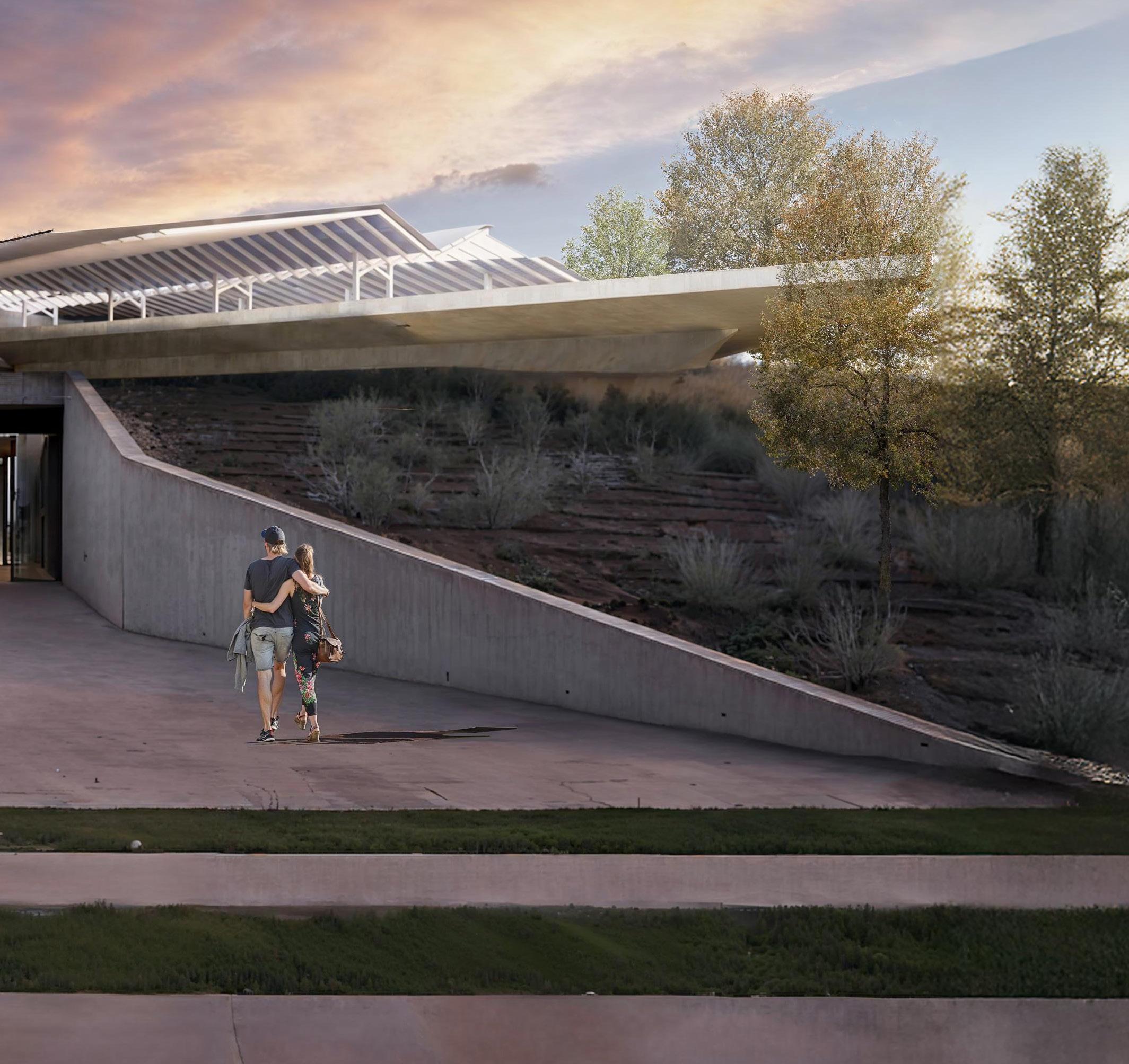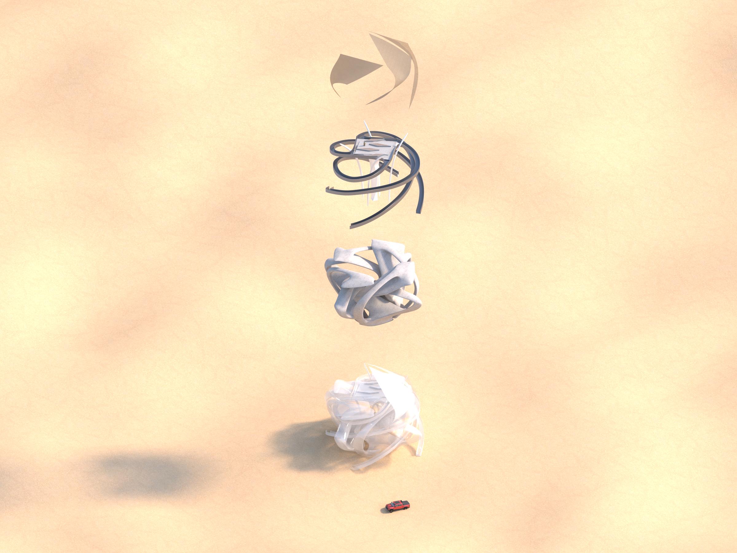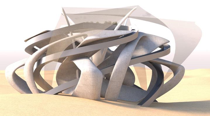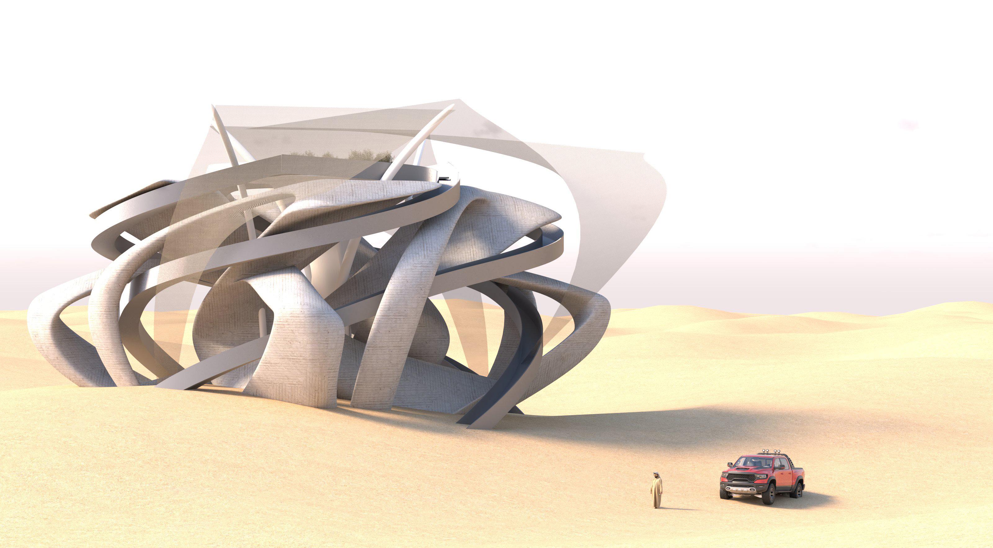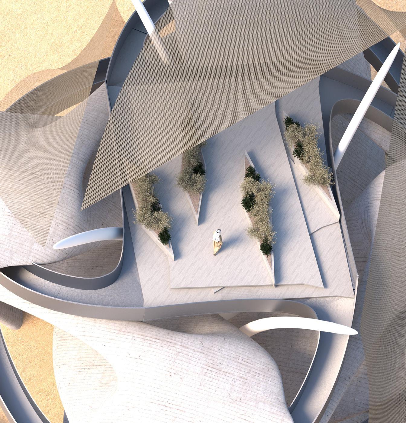 The design of the desert island establishes a continuous fluid connection between the area surrounding it and the interior of the building. The landscape, as the main surface accessible to it all, as part of the urban design of a natural desert, rises in such a way as to equally embrace the public interior space and define a sequence of event spaces dedicated to the collective celebrations of the modern and traditional culture of an endless natural desert. Thoughtful structures of undulations, branches, folds, and distorted surfaces of the dunes transform into an architectural landscape that performs many functions, welcoming, embracing, and guiding visitors through different levels of the interior.