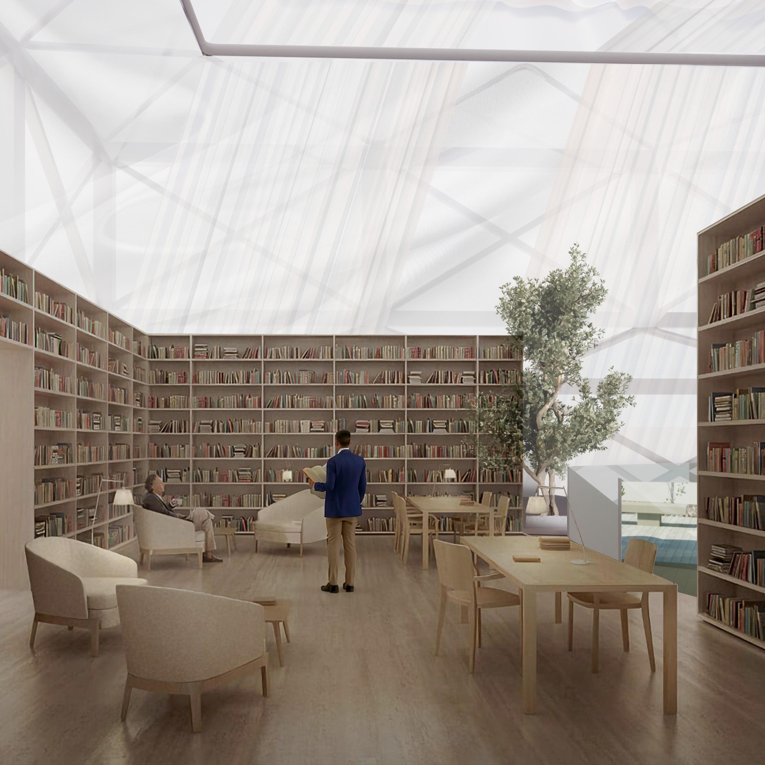 This library interior is designed to celebrate serenity and intellectual engagement. The soft, diffused light filters through a tensile canopy structure, creating an ethereal ambiance that encourages focus and contemplation. The spatial arrangement fosters intimacy while maintaining openness, with natural materials reinforcing the connection to sustainability and human scale.