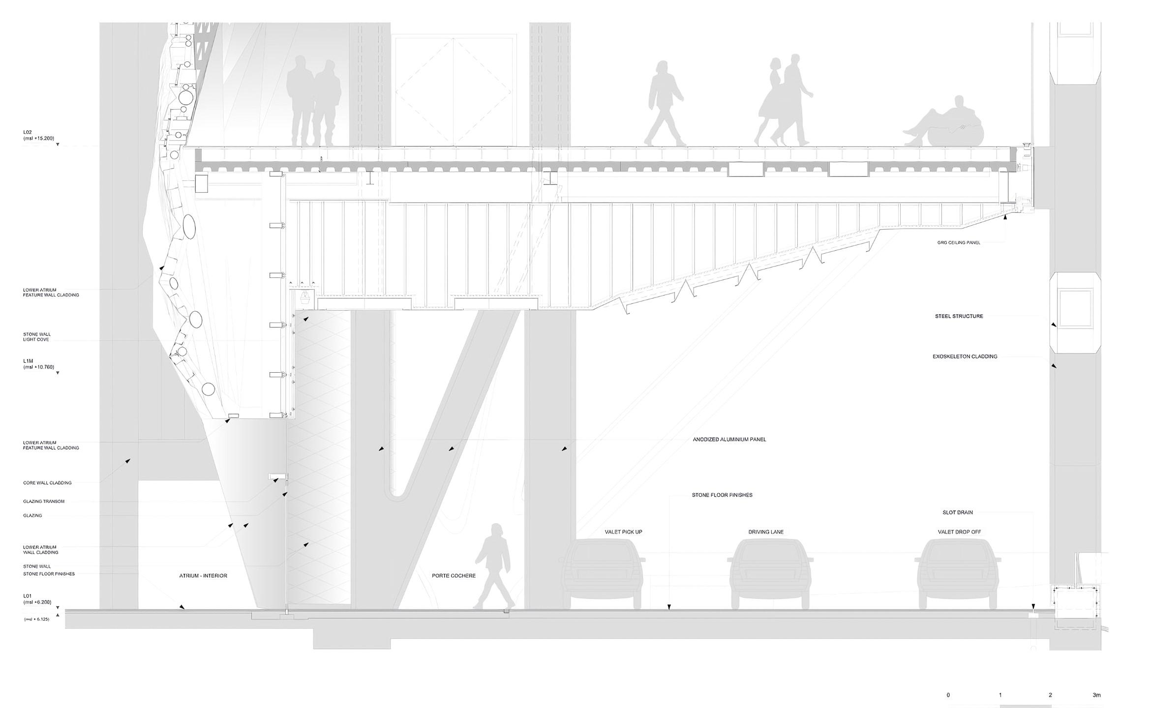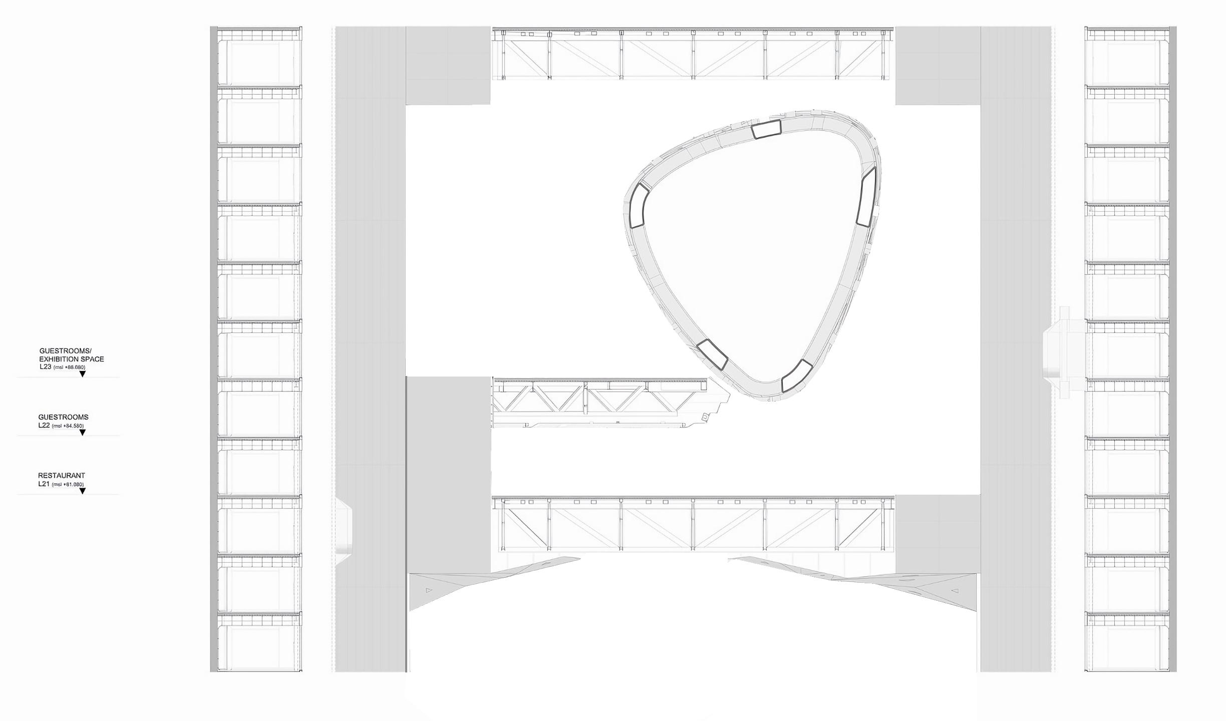 Sky Tougher employs an exoskeletal framework, visible in the sectional drawings, which integrates structural support with aesthetic form. The exterior lattice structure not only provides stability but also defines the building’s iconic visual identity. This structural strategy minimizes the need for internal columns, allowing for open, flexible spaces within. Steel beams and anodized aluminum panels are used throughout, ensuring durability and a modern finish. Key load-bearing elements are strategically positioned to accommodate large voids in the façade, creating the building’s distinctive fluid geometry.