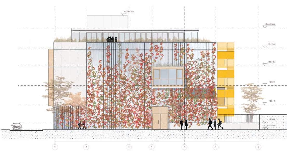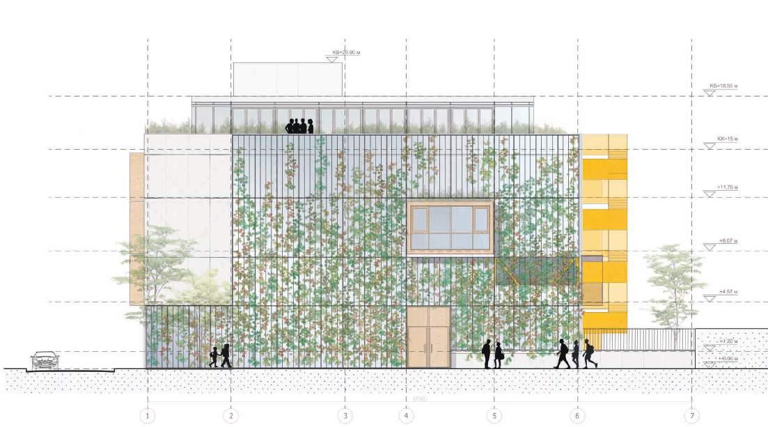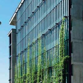 Green facades use creeping plants that climb on specially adapted structure as a second facade of the building. The plants are planted in the ground, near the building, in pots on the terraces or on the roofs.