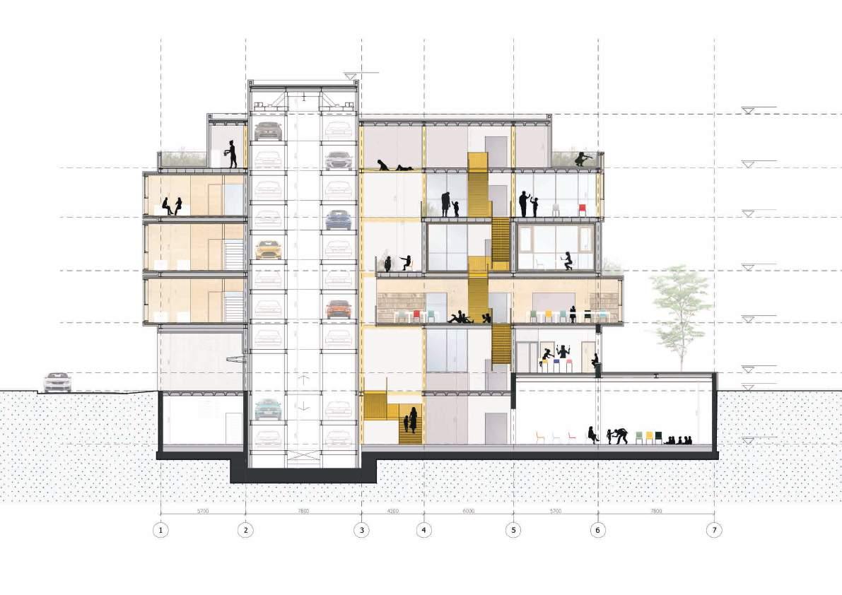 Since the focus of the task are children, a decision is made to optimize the structure by using an automated parking system. This solution provides parking for 20 cars (10 levels with 2 cars per level) taking minimum area. It also plays an active role in the interior of the building.