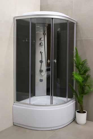 90 x 90 x 215 cm, polukružna, aluminijski profili, kaljeno staklo debljine 4 mm, pozadina tuš kabine od crnog kaljenog stakla, ABS kada visine 40 cm s uklonjivom prednjom oblogom 369820