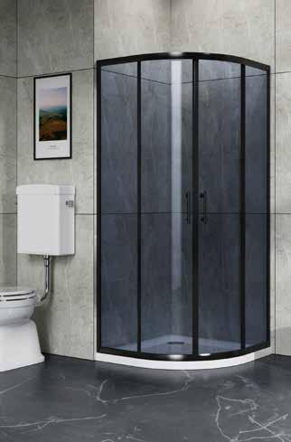 90 x 90 x 215 cm, polkrožna, aluminijasti profili, kaljeno steklo debeline 4 mm, zadnji del kabine za prhanje iz črnega kaljenega stekla, kad ABS višine 40 cm s snemljivo sprednjo oblogo 369820