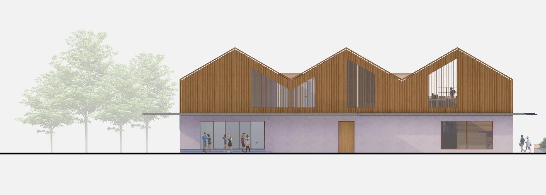 Finally, the building has a stepped volume towards the park where the workshop is located on the ground floor and the offices are on top. This arrangement provides access to the roof terrace, allowing workers to enjoy the fresh air and take a break with a view of the park.