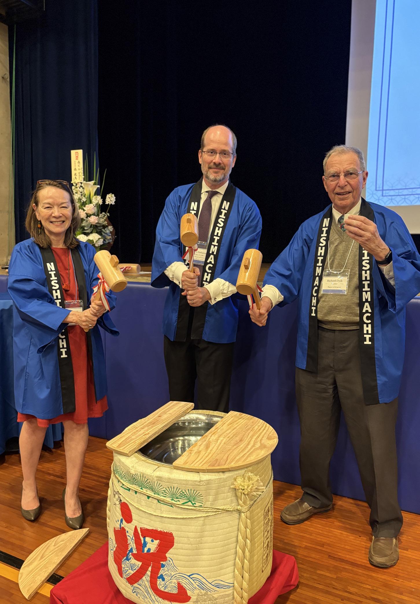 A 75th Anniversary Kagami-biraki (鏡開き) by Karen O’Neill ‘78 Head of School, Chris Hathaway ‘90 Board Chairperson, and Richard Dyke, Nishmachi Trustee.