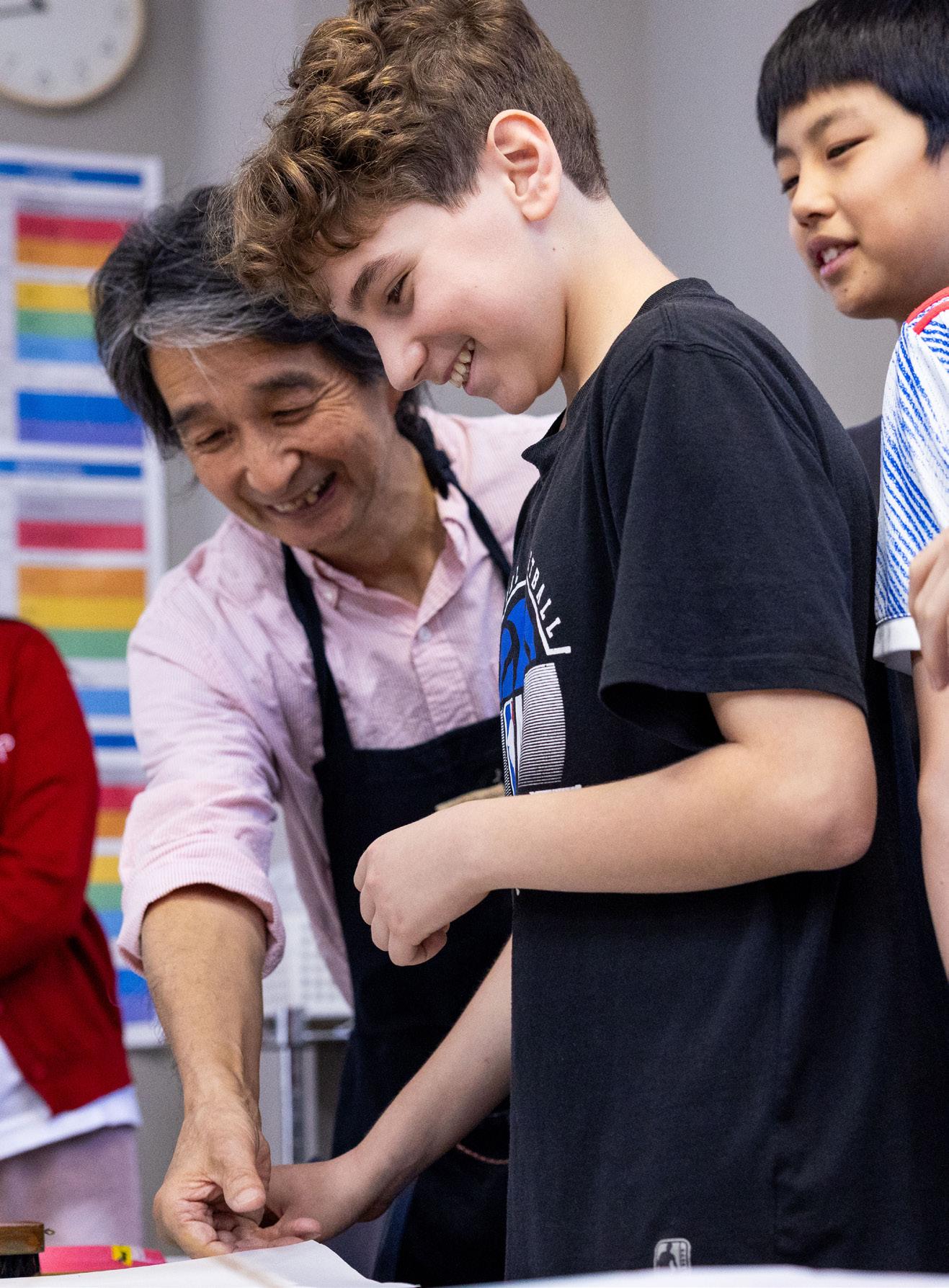Artist Taika Kinoshita creates woodblock prints with Middle School students.