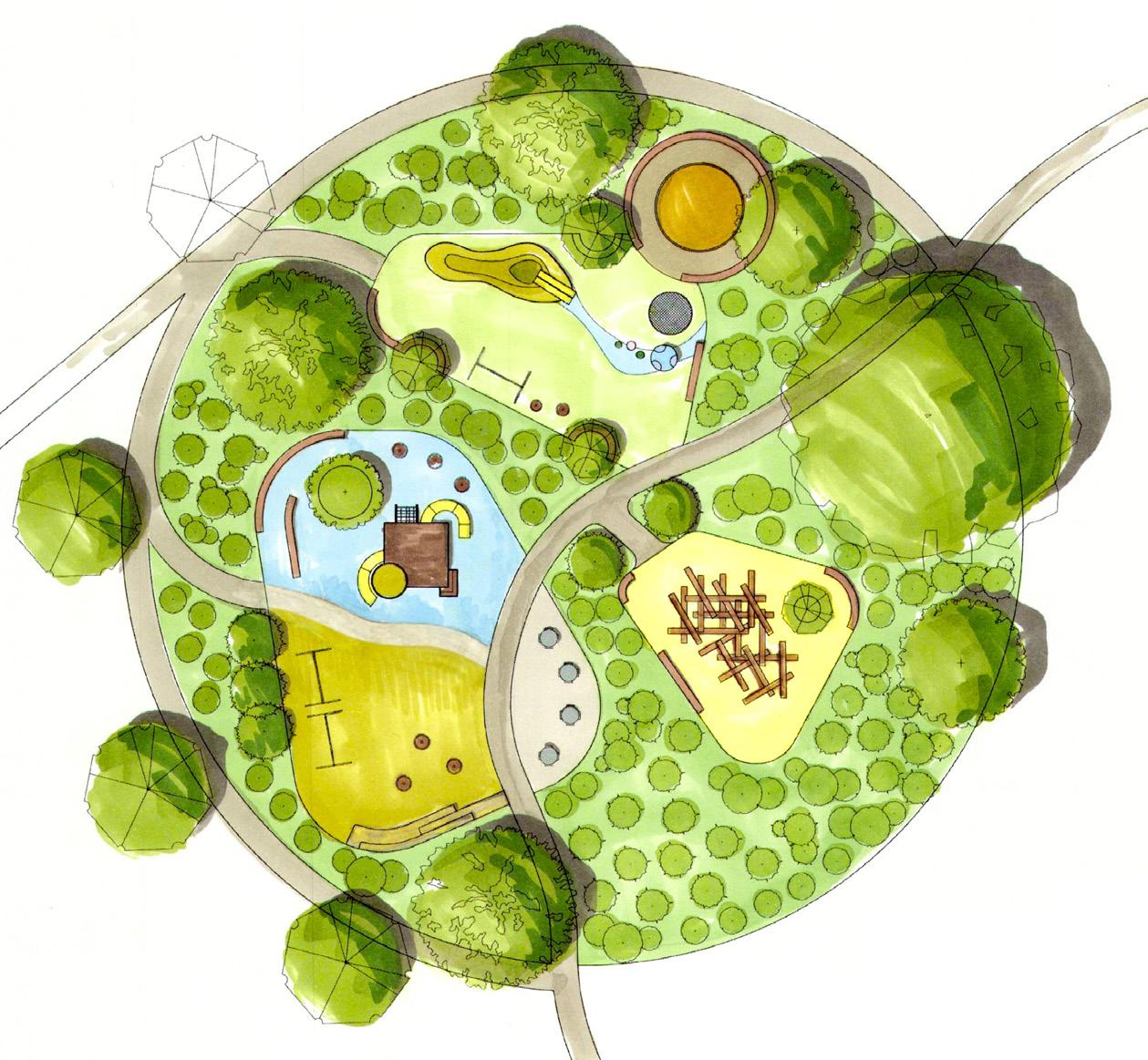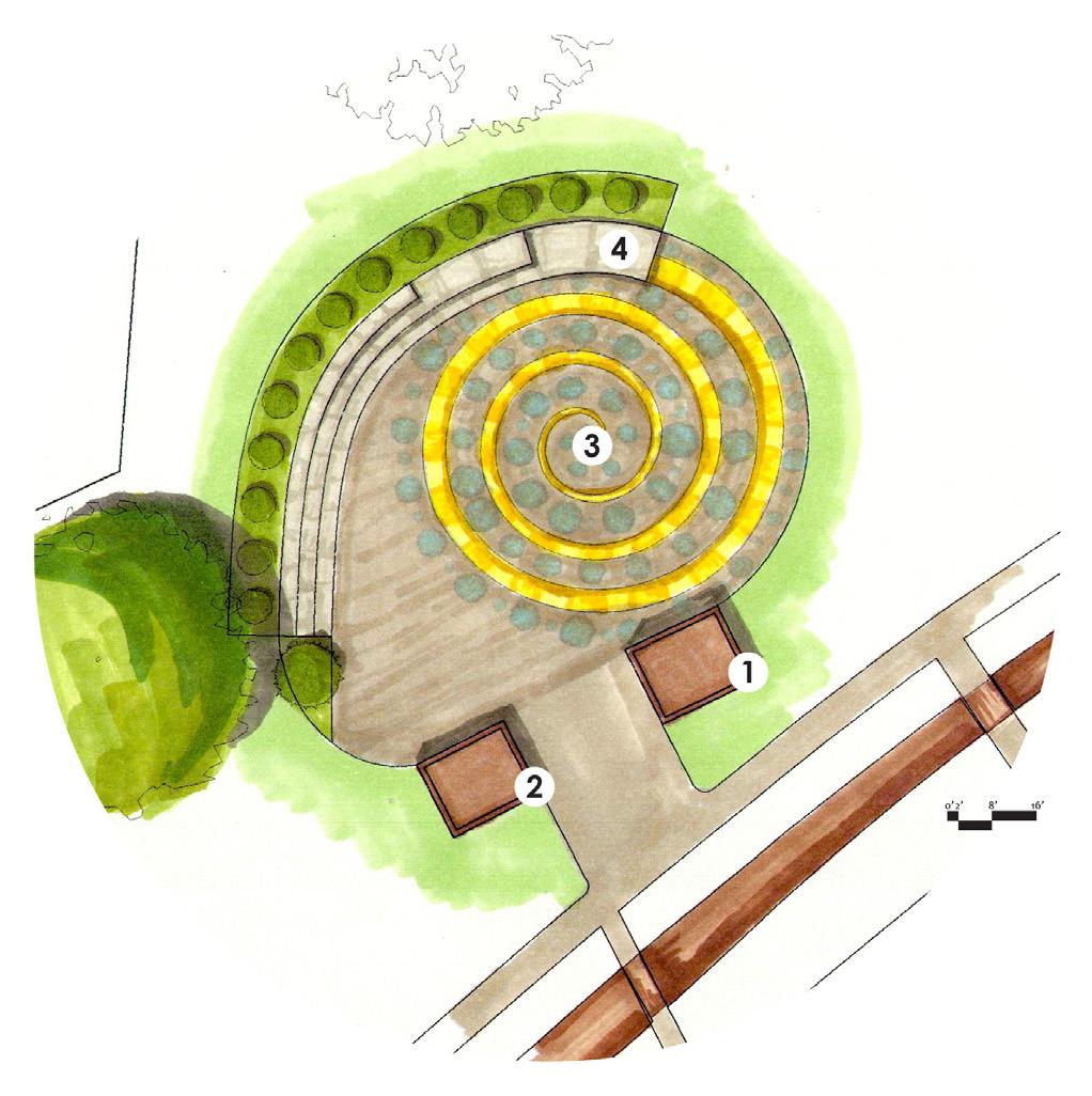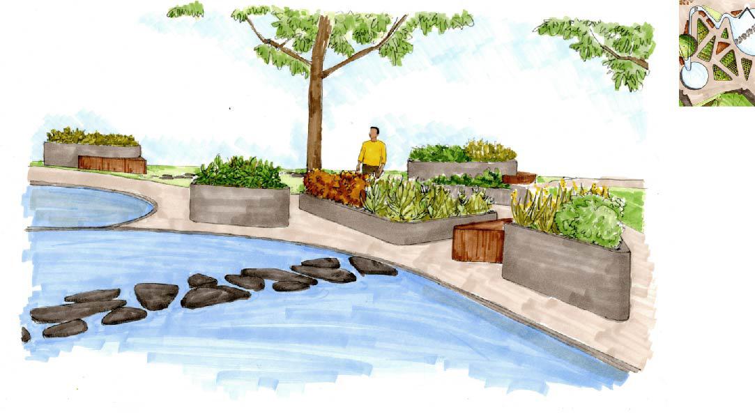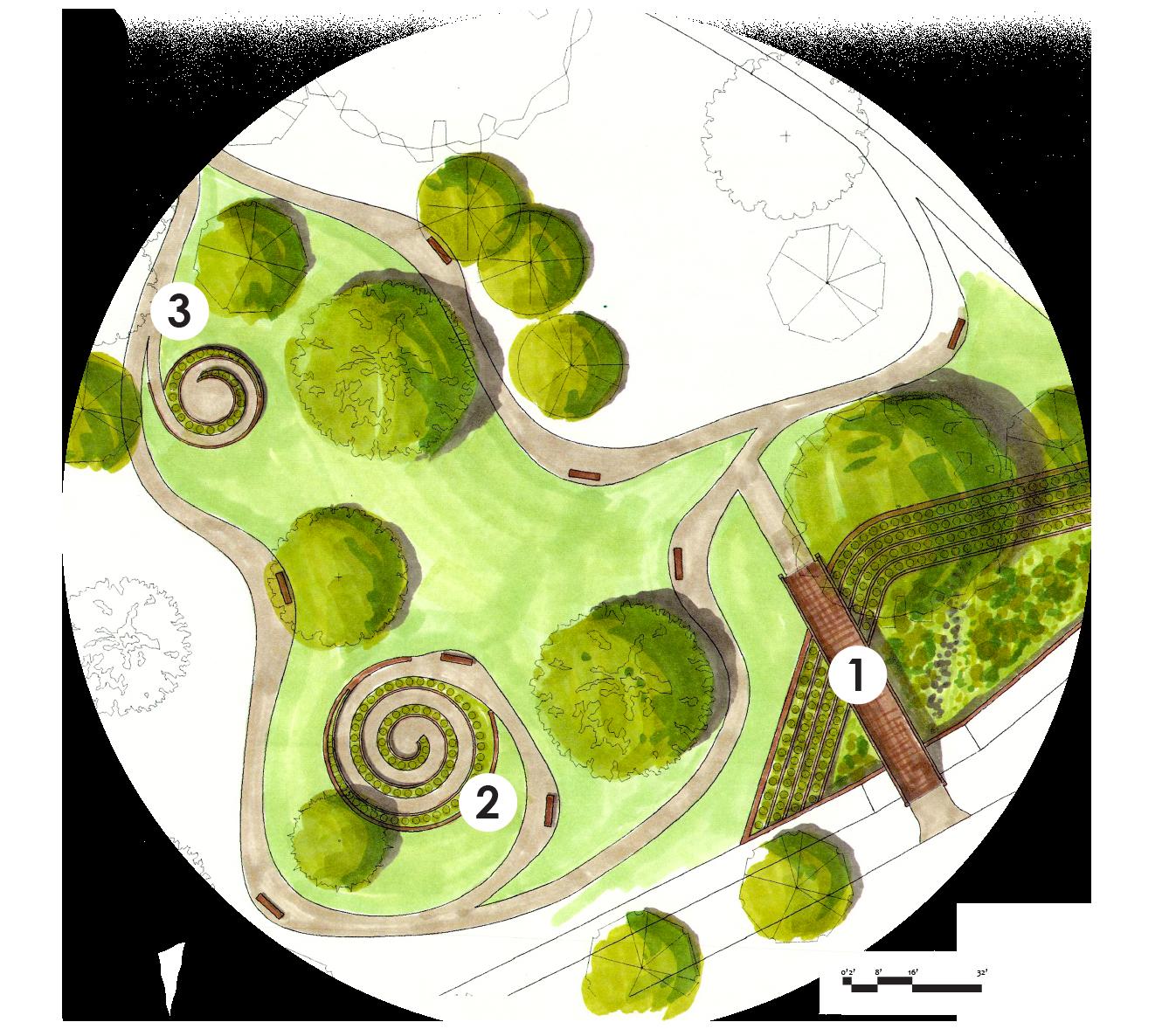 The goal of the healing garden is to create a retreat from the outside world. Connections with nature can help reduce stress, healing the body and mind. This garden’s form takes inspiration from brain wave patterns and has three main uses: a yoga space, a sensory garden and a meditation area. The stream at the entrance to the garden takes a more jagged shape like gamma waves and eventually relaxes into the easier shapes of the theta or delta waves. The spaces of the garden also correspond to the wave pattern, transitioning from spaces for activity and socializing to quieter, private and contemplative spaces.