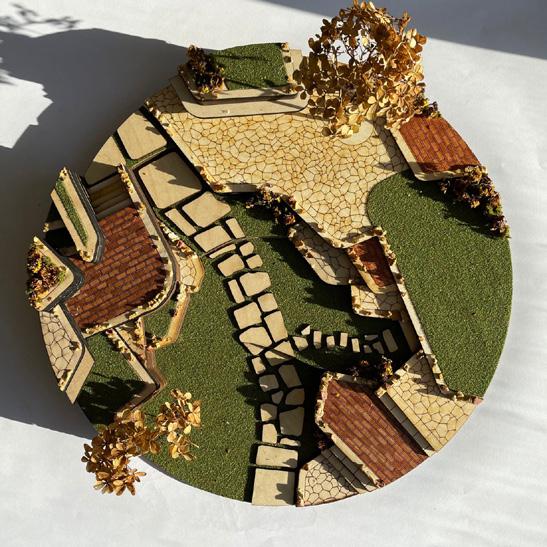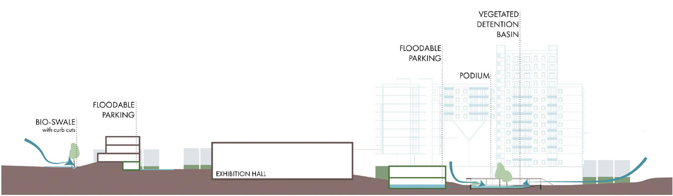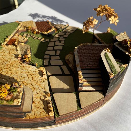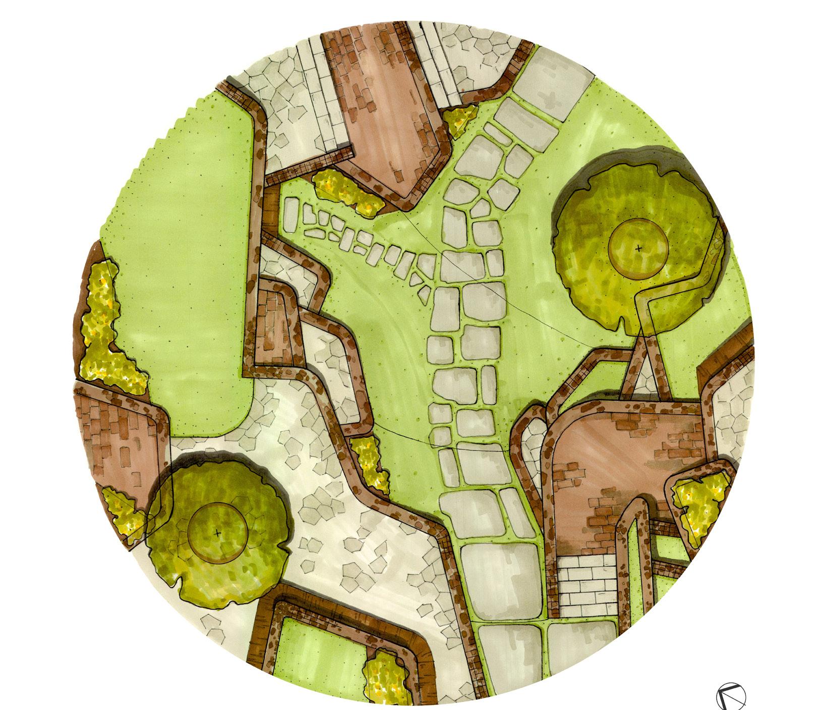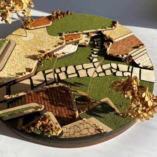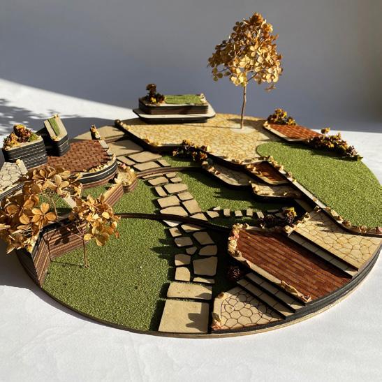 The goal of the healing garden is to create a retreat from the outside world. Connections with nature can help reduce stress, healing the body and mind. This garden’s form takes inspiration from brain wave patterns and has three main uses: a yoga space, a sensory garden and a meditation area. The stream at the entrance to the garden takes a more jagged shape like gamma waves and eventually relaxes into the easier shapes of the theta or delta waves. The spaces of the garden also correspond to the wave pattern, transitioning from spaces for activity and socializing to quieter, private and contemplative spaces.