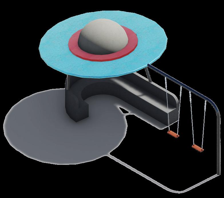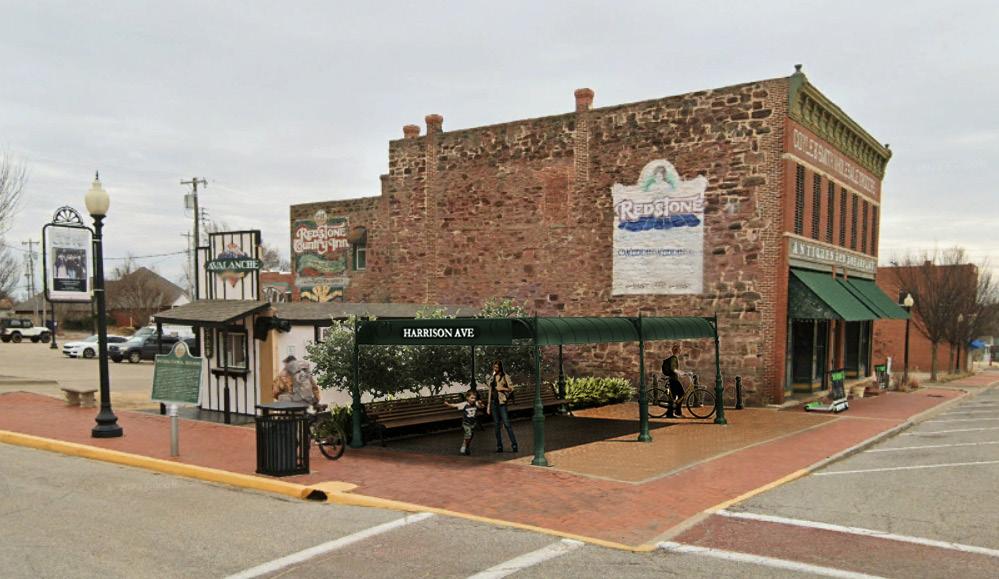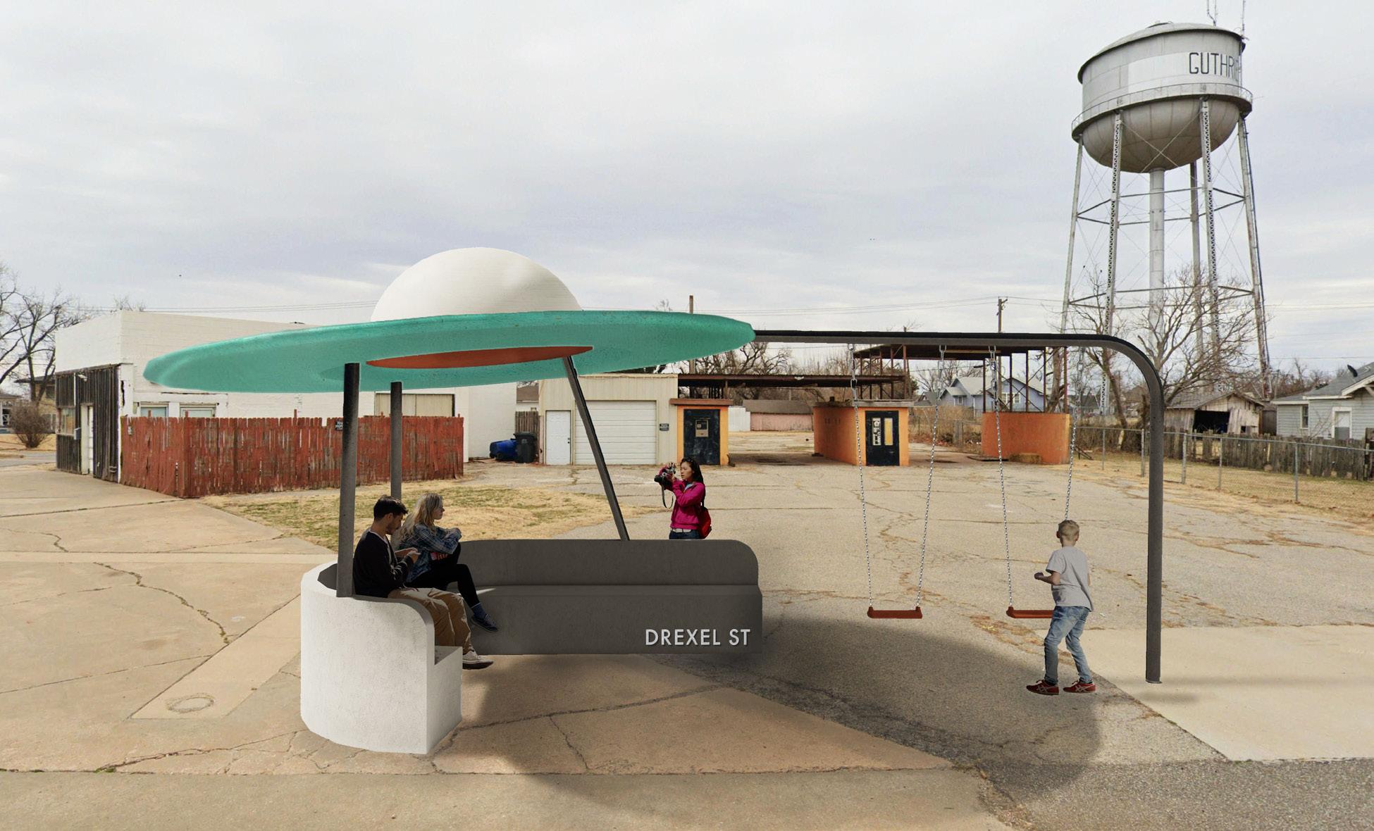 These trolley stops can also be a way to attract a different type of tourist - those interested in oddities & roadside attractions. These are a big draw for many people. For example, there are clearly some well known locations through Oklahoma such as Pops and the Blue Whale of Catoosa. This idea can create another iconic landmark for Guthrie & draw people in that may not stop just for historic architecture. The Drexel St. stop is just beyond the Scottish Rite Temple on the east side of town. This is a prime location to bring people into Guthrie off of the highway. The stop is also supposed to be playful with a whimsical structure and swings. The metal ufo sculpture framing the water tower in the background could act as a photo opportunity and nods to iconic roadside attractions popular across the United states. The stop is designed to be, all at once, a bus shelter, roadside attraction, playground and sculpture.