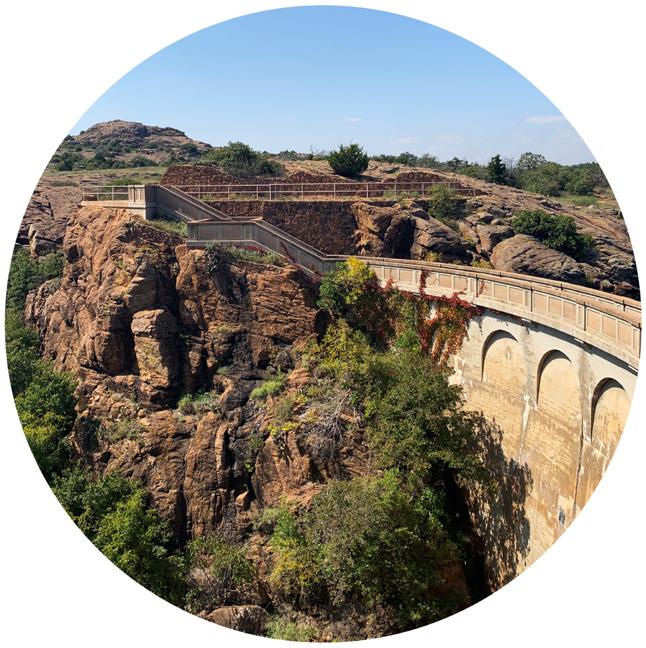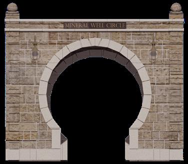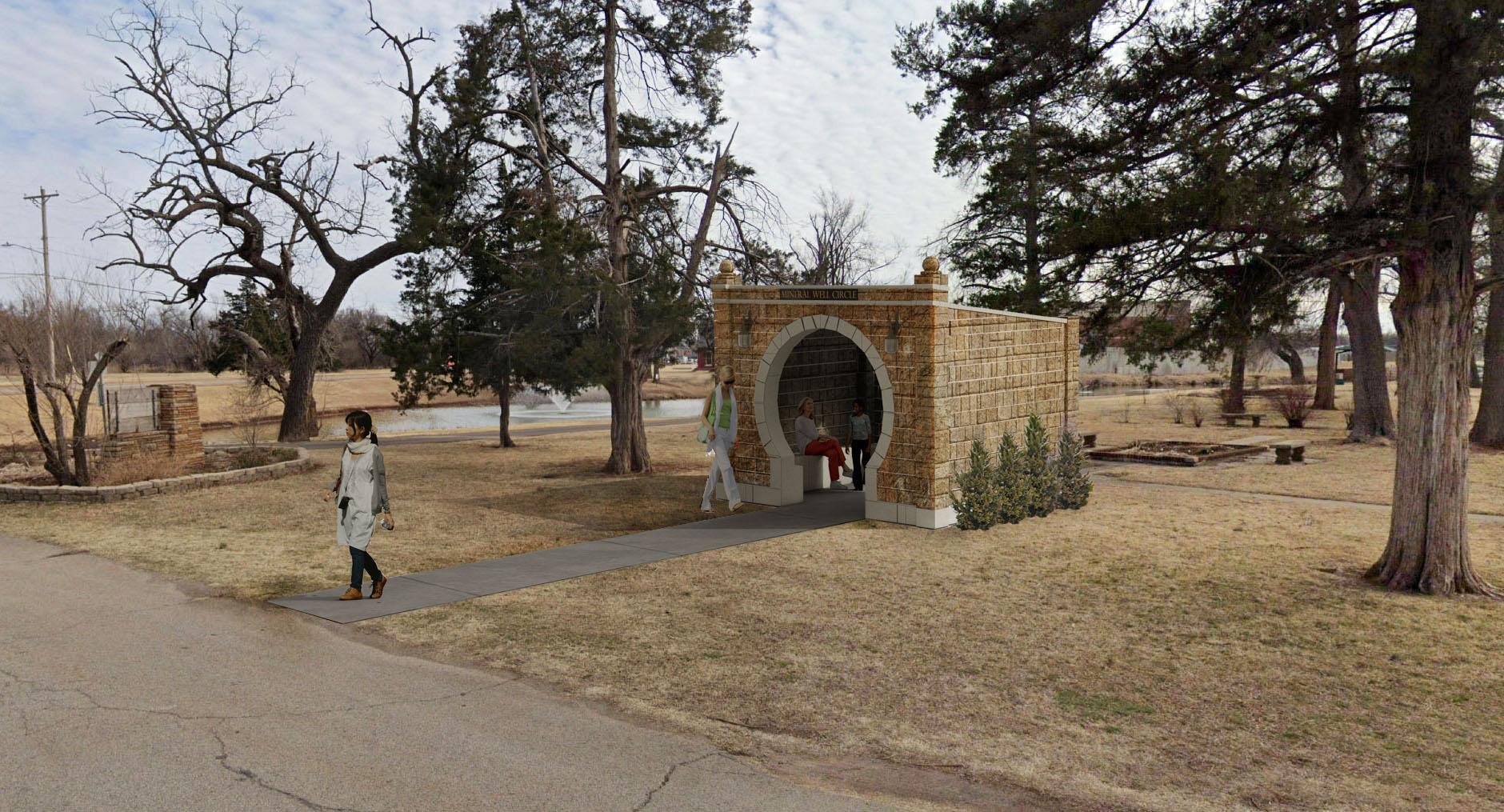 Mineral Wells Park visitors rest at the stone structure that echoes its natural setting. The arch and wall lamps recall Guthrie’s famous historic architecture.