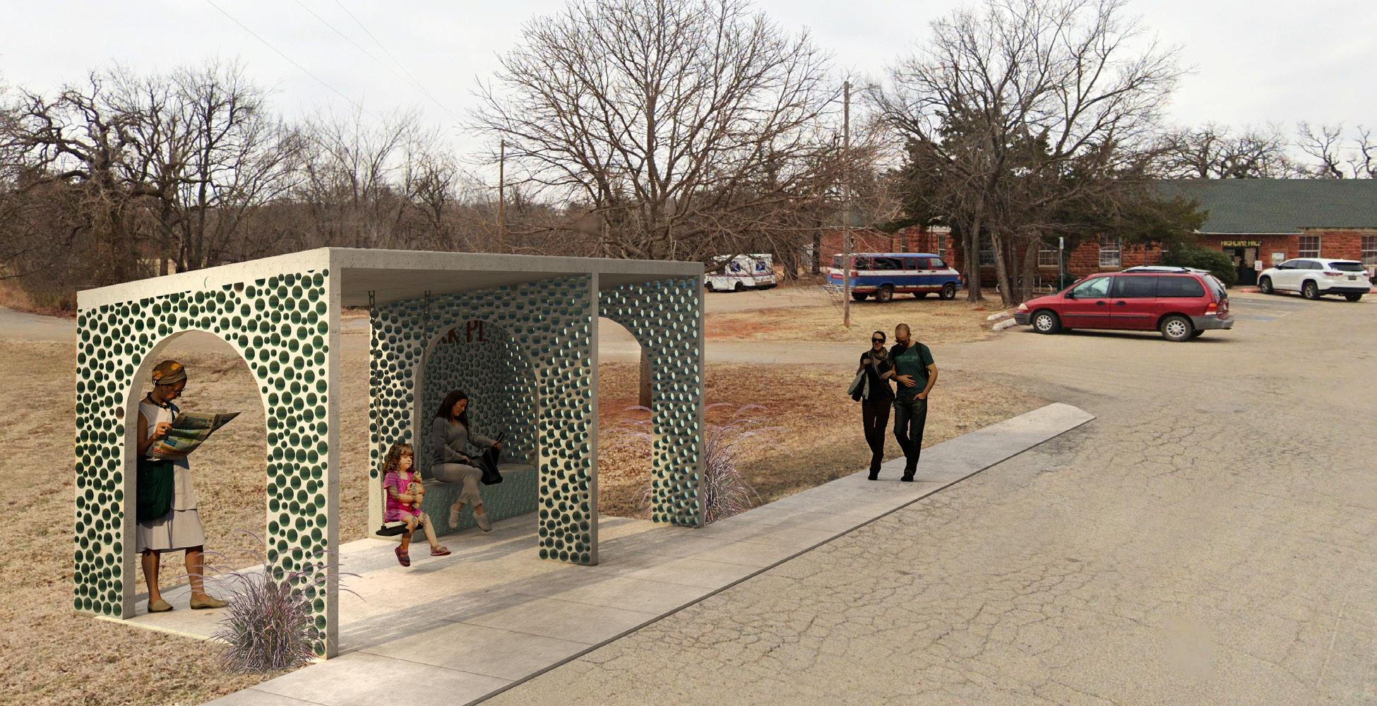 The historic trolley route has been rethought as another way to reduce vehicle traffic in downtown Guthrie and grow the city’s access to public transportation. Visitors can park their cars in west Guthrie at the Elbow Project and use the trolley system to travel around town. The goal for the trolley route was not just to grow public transportation, but also create interest points with each stop. This project features unique styles for each shelter inspired by their different locations. They have a progression of styles that honor the historic district and past of Guthrie, but also look forward to new styles for the city.