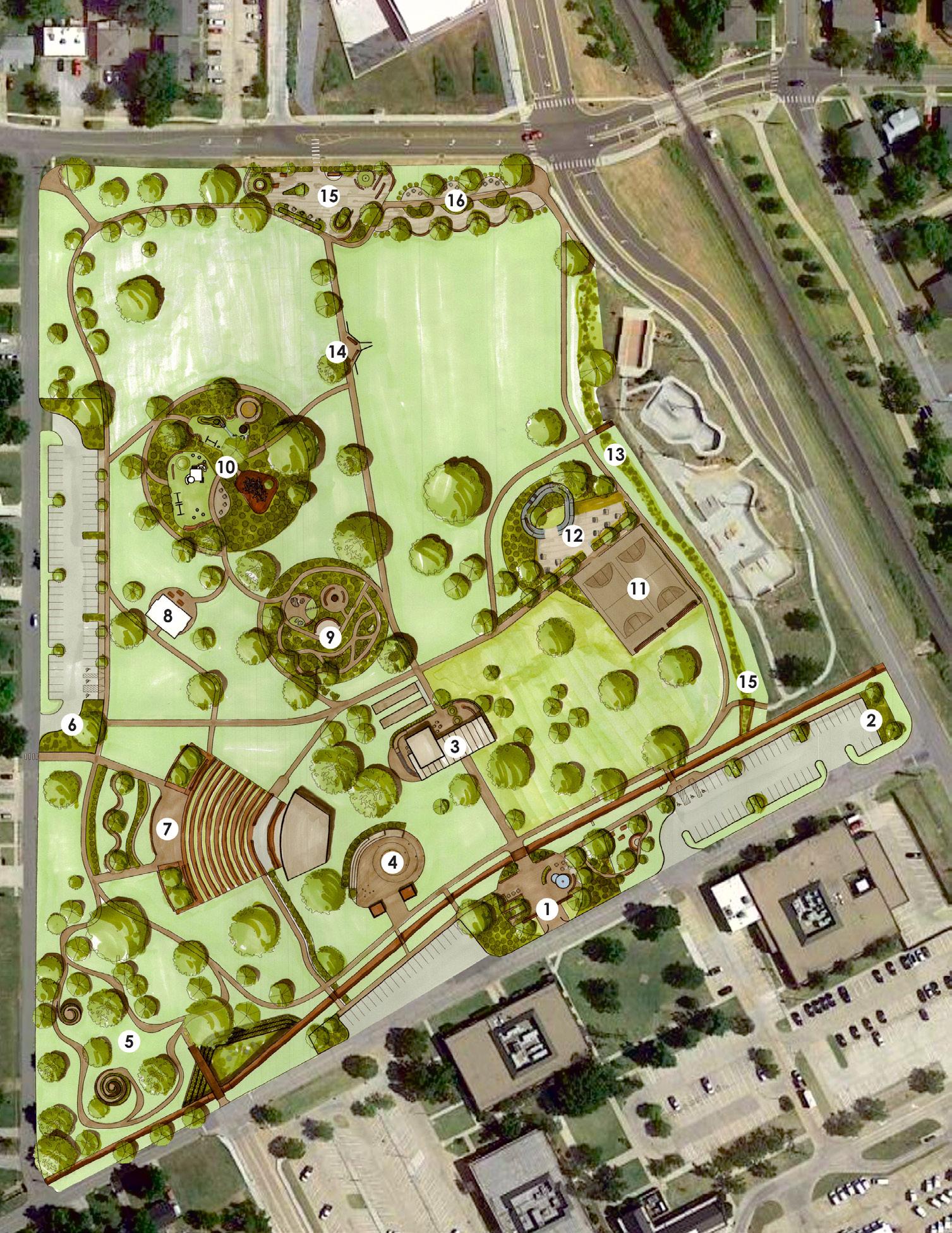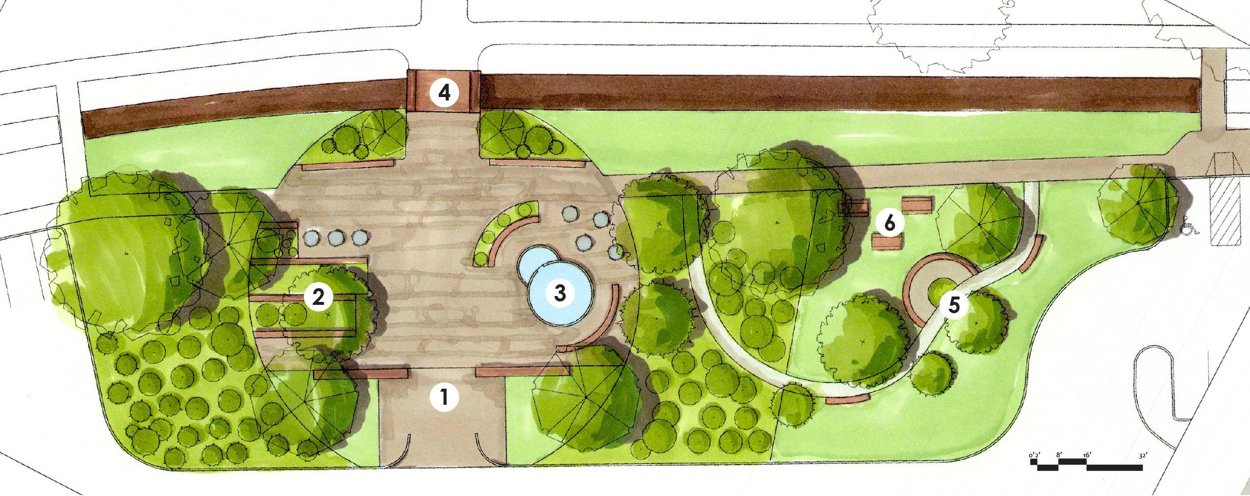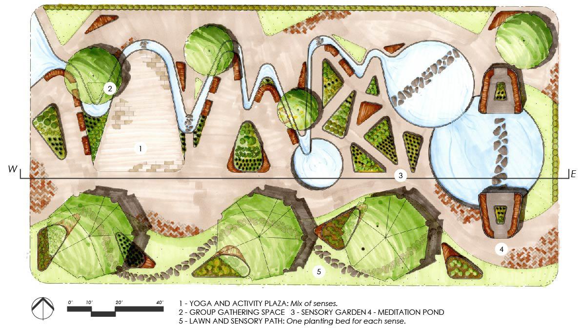 A visitor enters into the activity plaza where yoga classes are held. They then walk along the main path to group sitting areas, to the sensory garden with private sitting areas, to the quiet meditation pond and buildings. They can relax on the lawn before exiting the garden via the small stone path through the lawn. The shallow stream provides soothing sounds and the opportunity to touch or walk through the water throughout the garden.