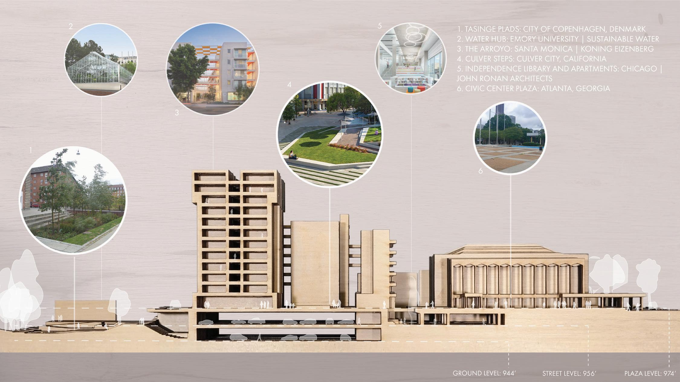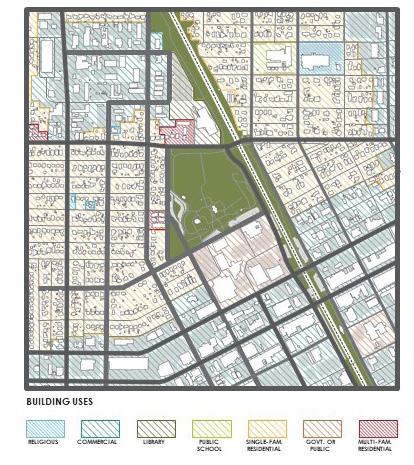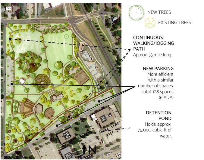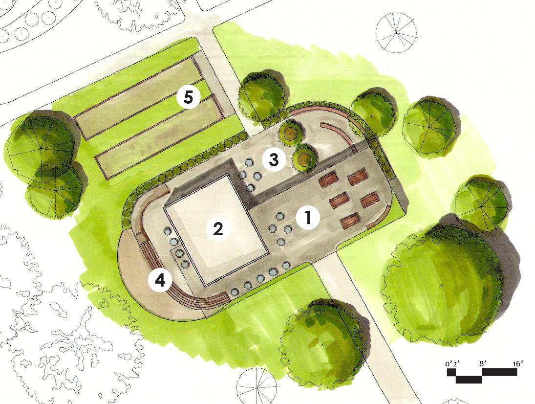 • Plaza should be an extension of library with shaded picnic and working tables.