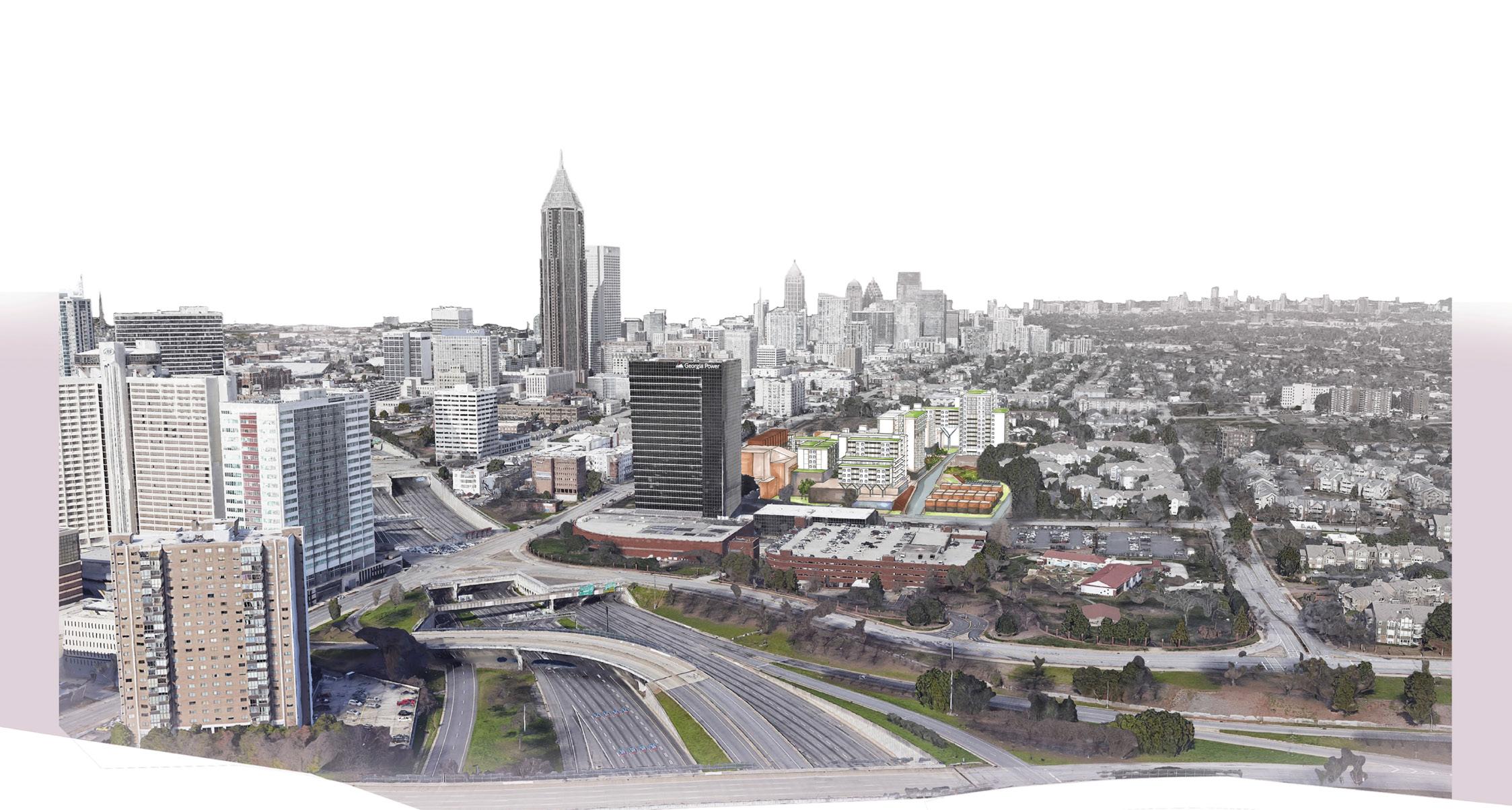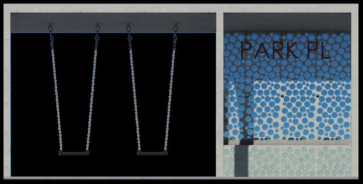 The stop at Highland Park, Park Pl, reinterprets the Works Progress Administration style of architecture found around the area. The stop is located down the street from Highland Hall. The trolley travels around the park loop, providing visitors with enough time to notice the arrival of the trolley before it stops. The red stone of Highland Hall and other New Deal is difficult to come by today, but we can still take inspiration from this resourceful style that uses inexpensive and local material. In this case the shelter is made of reused glass bottles and concrete structure. And, since this stop is at a park, the intent for this shelter is to be colorful and playful, featuring different hues of glass and swings for people to use while they wait.