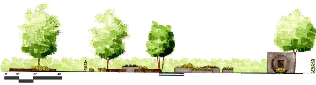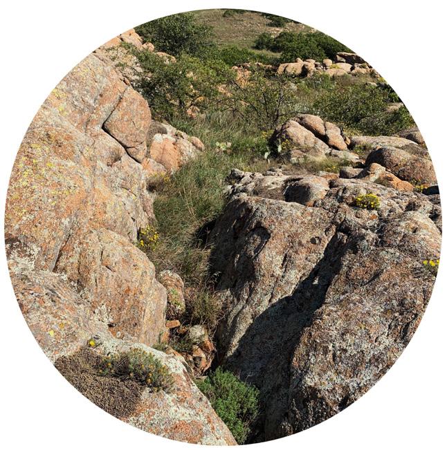 This conceptual pocket garden was inspired by the Wichita Mountains Wildlife Refuge in southwestern Oklahoma and is intended to be a glimpse of unique native Oklahoma landscape. Its basic form was influenced by the changes in elevation at the actual Wichita mountains, in this case on a much smaller scale. The garden’s shape is formed by gabion wall encircled “mountains” on either side with a ravine through the middle acting as the base path of circulation. The rocks in the gabion walls are larger at the bottom and smaller at higher elevations to create differences in texture that force perspective and create the illusion of height.