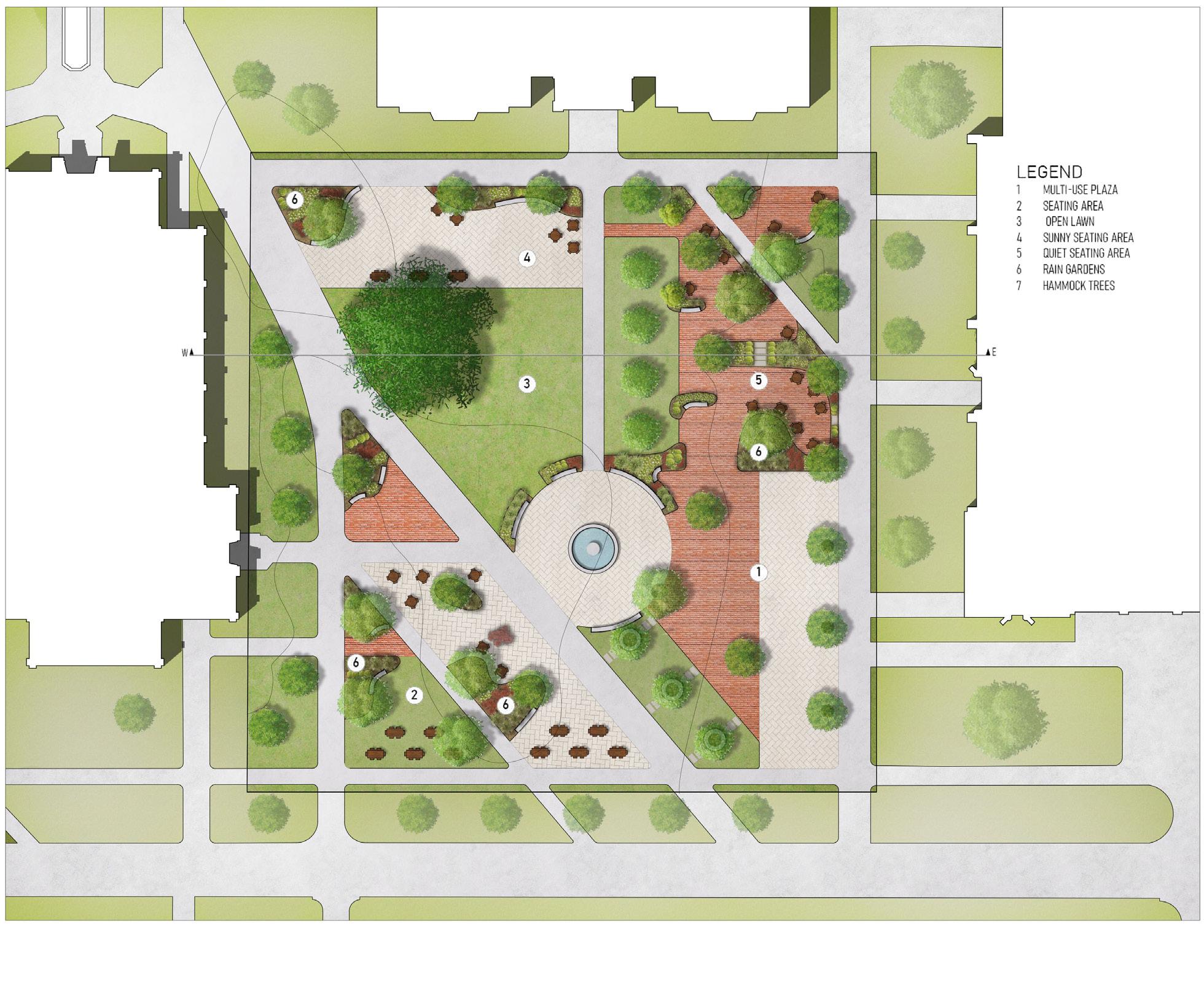 i. Create logical pedestrian routes based on analysis, widening paths and the site’s northwest entry.