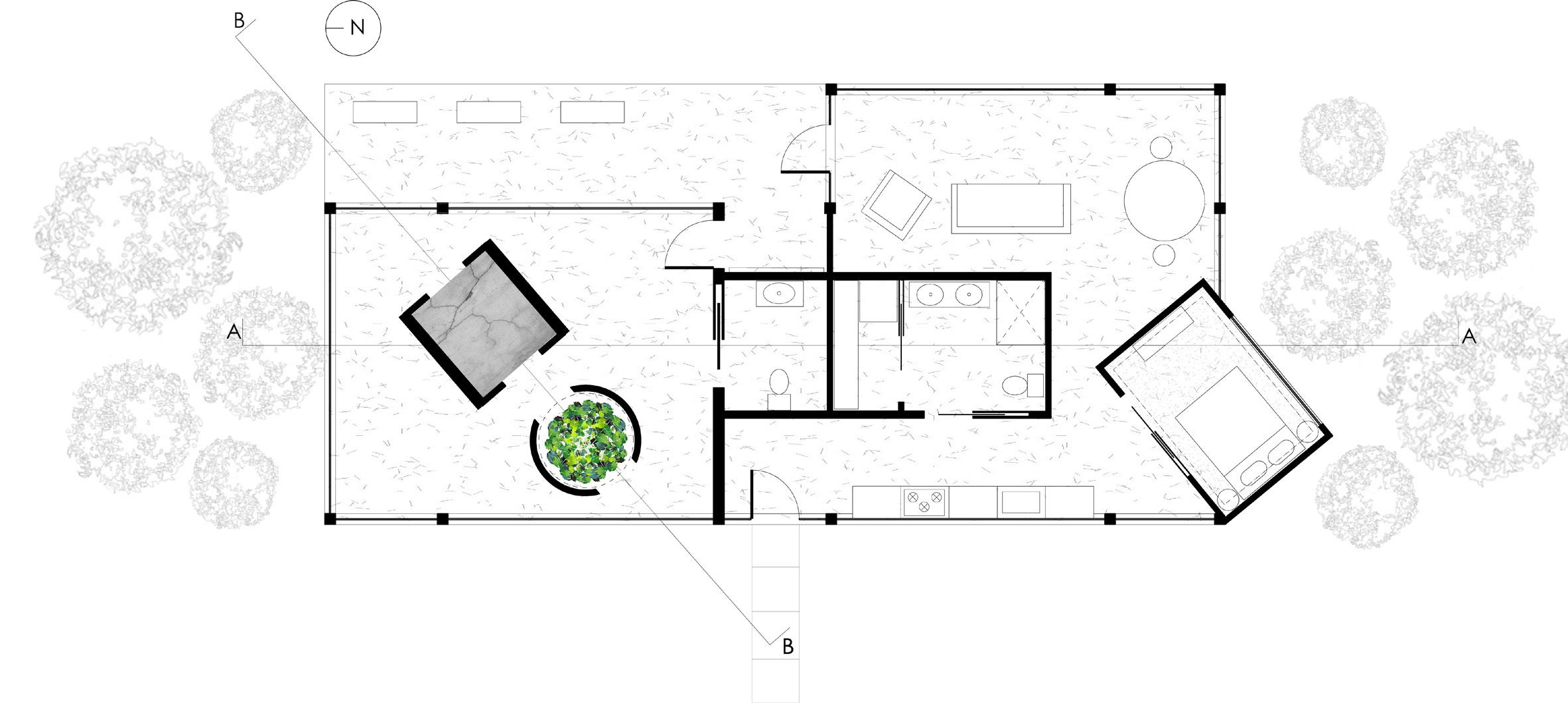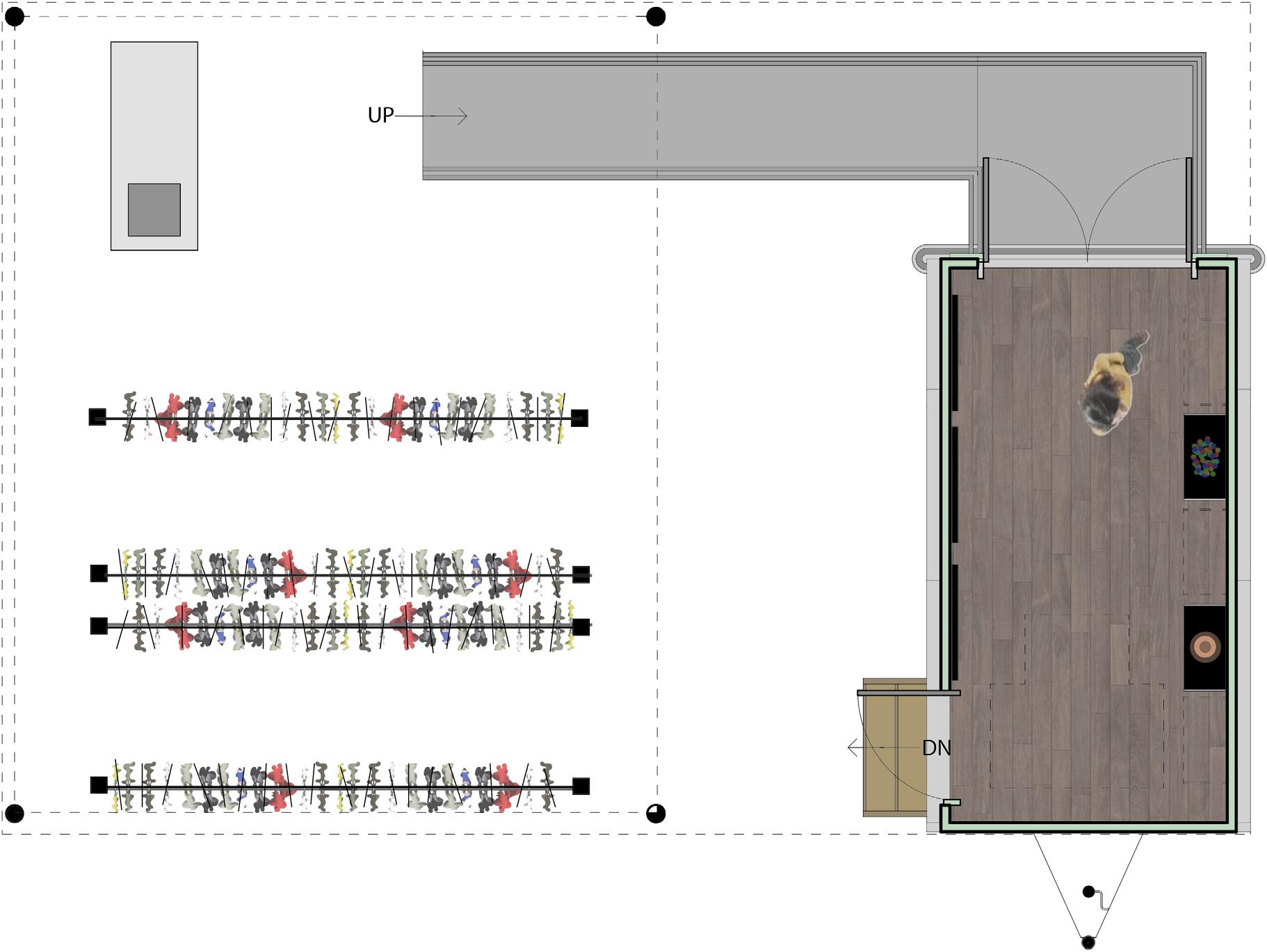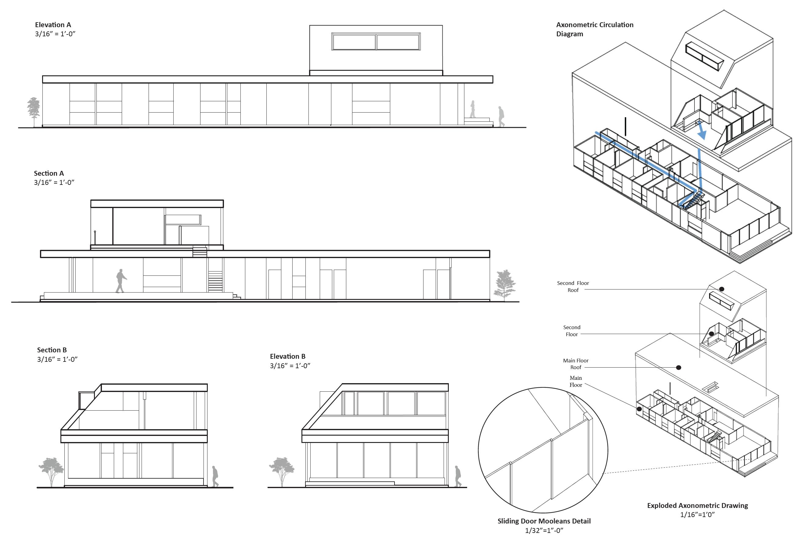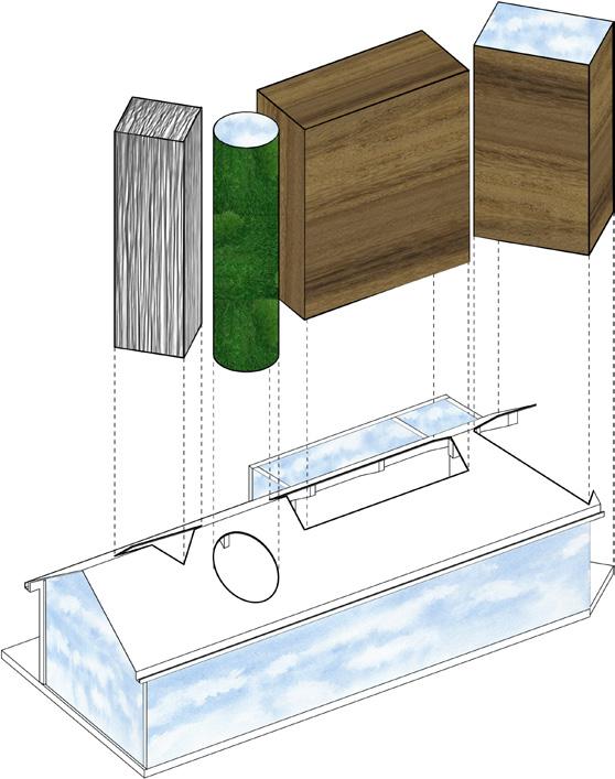 The system diagram shows the volume, materials, and aperture of the spacial system. The volumes show the only enclosed areas of the home. The exaggerated volumes represent the user’s exaggerated size at which he develops his photos. The first volume is made of industrial materials. The second, circular volume is covered in natural greenery. The last two volumes are made of natural wood to demonstrate the intention behind the user’s photography. Lastly, the areas of the diagram that show the blue sky are made of glass, which shows the aperture in the spacial system. This aids one design intention goal of creating harmony between the interior and exterior spaces.