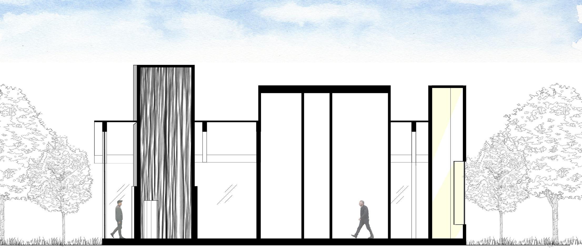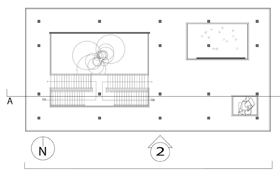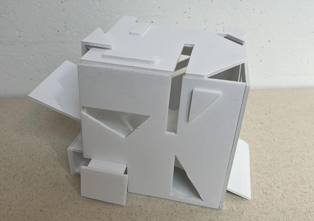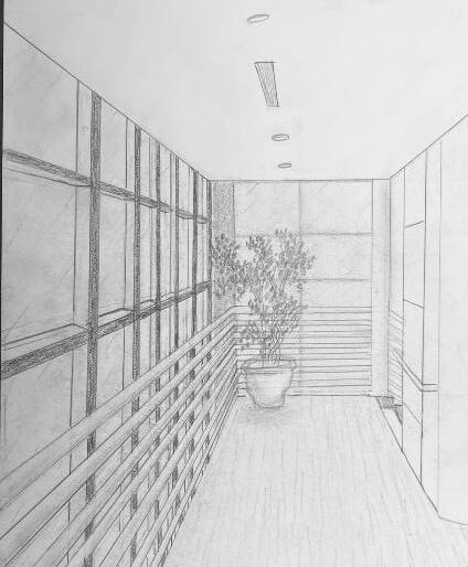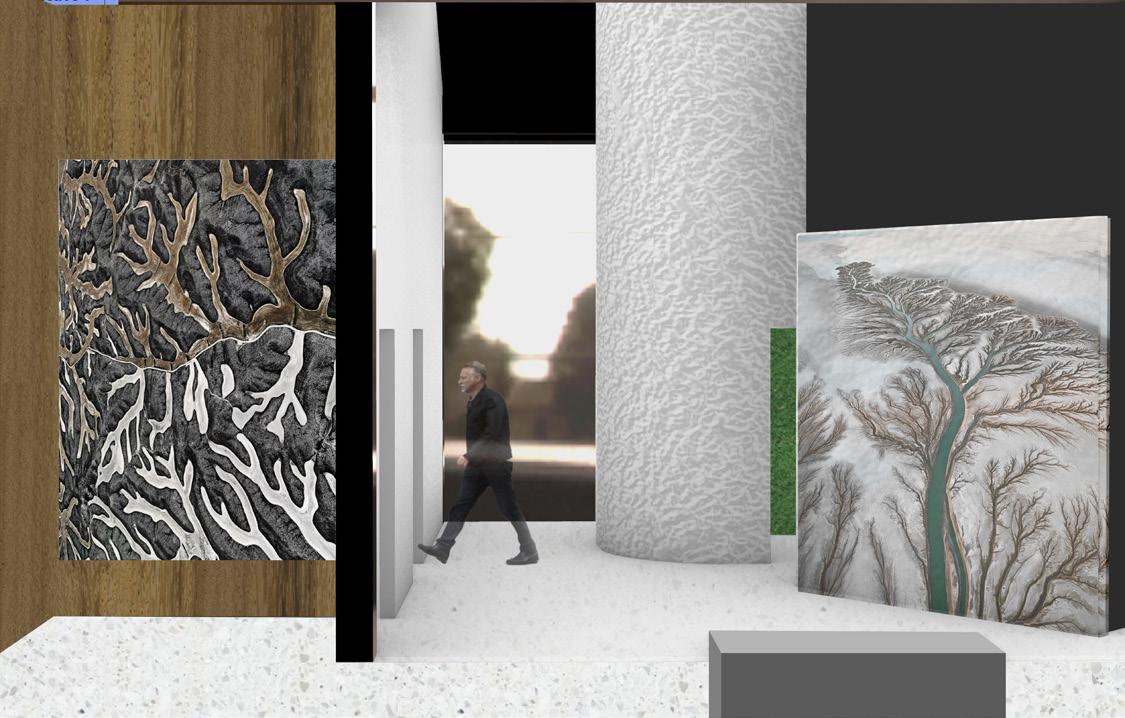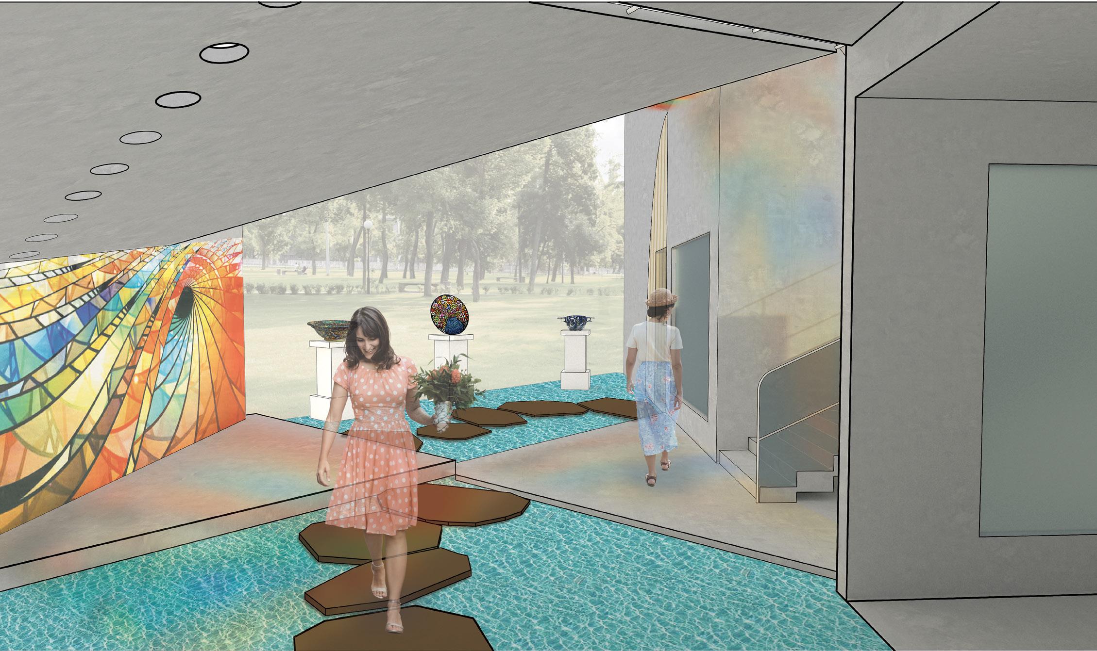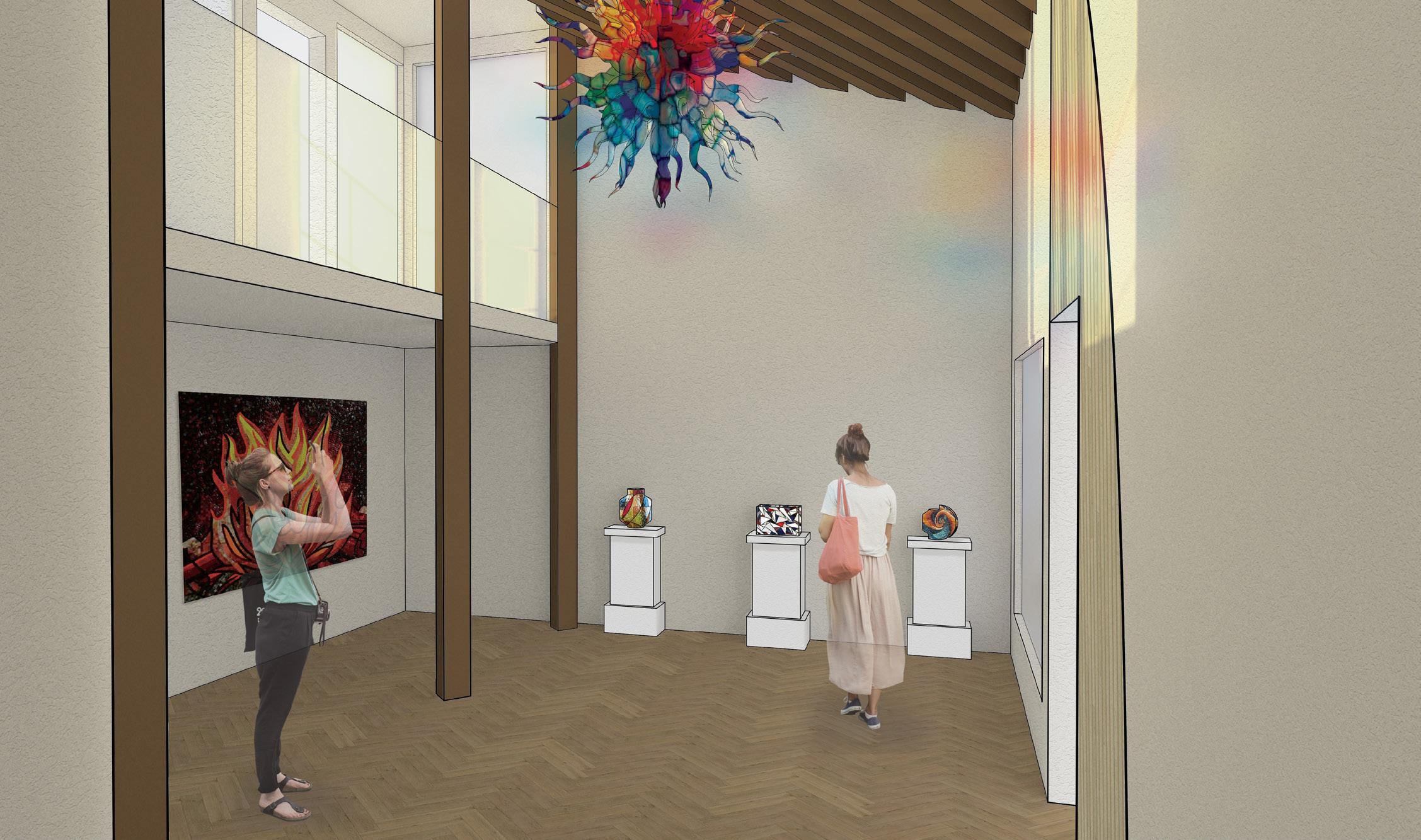 The instruction for this project was to design one space for a person to experience alone, another space for 8-10 people to experience. The design of this specific project was focused towards a mosaic glass artist with an area for a gallery, and an area for them to create their work. In the gallery, there is a feature ceiling with cascading beams, inspired by a previously studied precedent project. In addition, stairs lead the visitors from the exterior to interior of the gallery to allow them to see a different perspective of the artwork. Visitors can see the studio from the gallery through a procession of windows. An intention of this project was for there to be an experience at every stopping point. In various spots, visitors may see the artist’s work either in an overhanging plane or in the large overbearing wall. Stepping stone guide the circulation from one space into the next. To contrast with the sharp lines of the buildings and planes, circular apertures can be seen on the diagonal overhang of the studio space and an arched doorway into the gallery was added. The materiality of the space is neutral to provide emphasis and make the mosaic artwork the focal point.