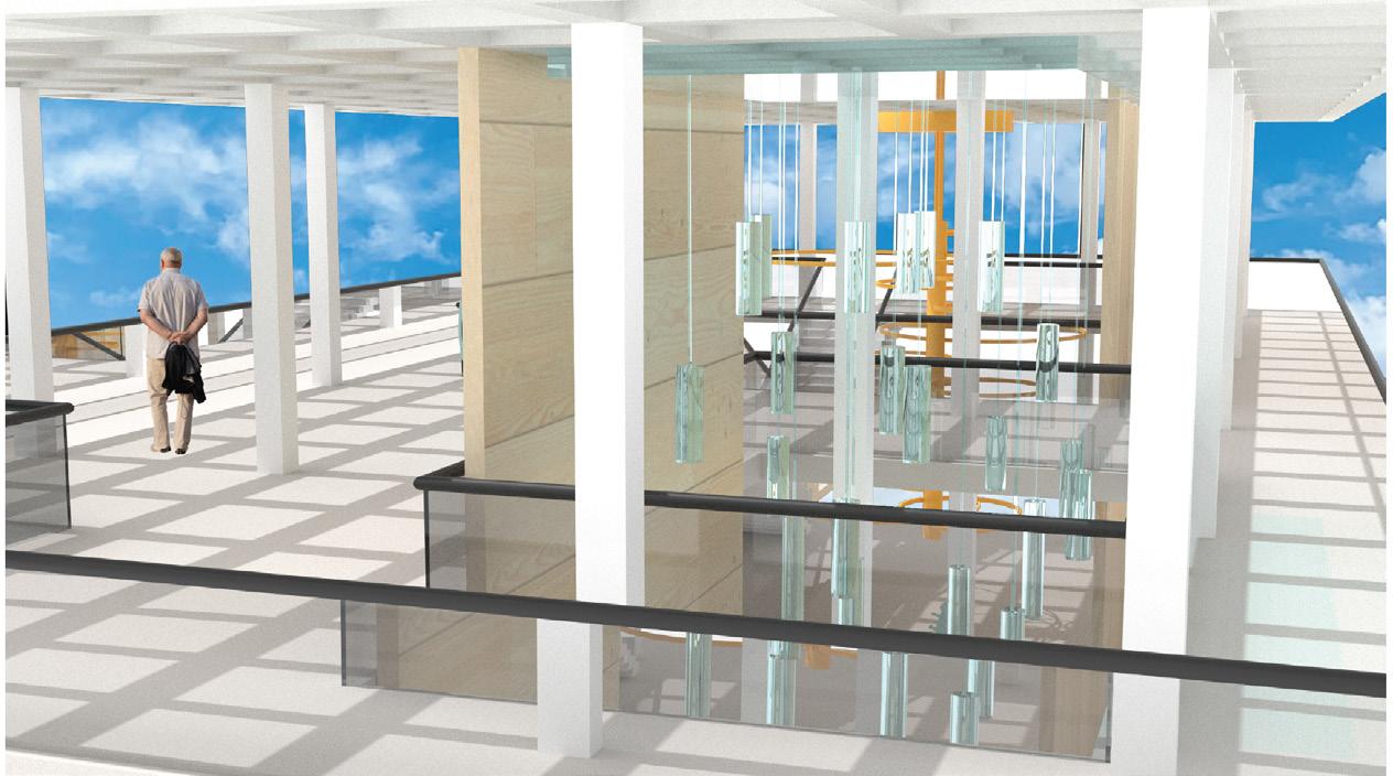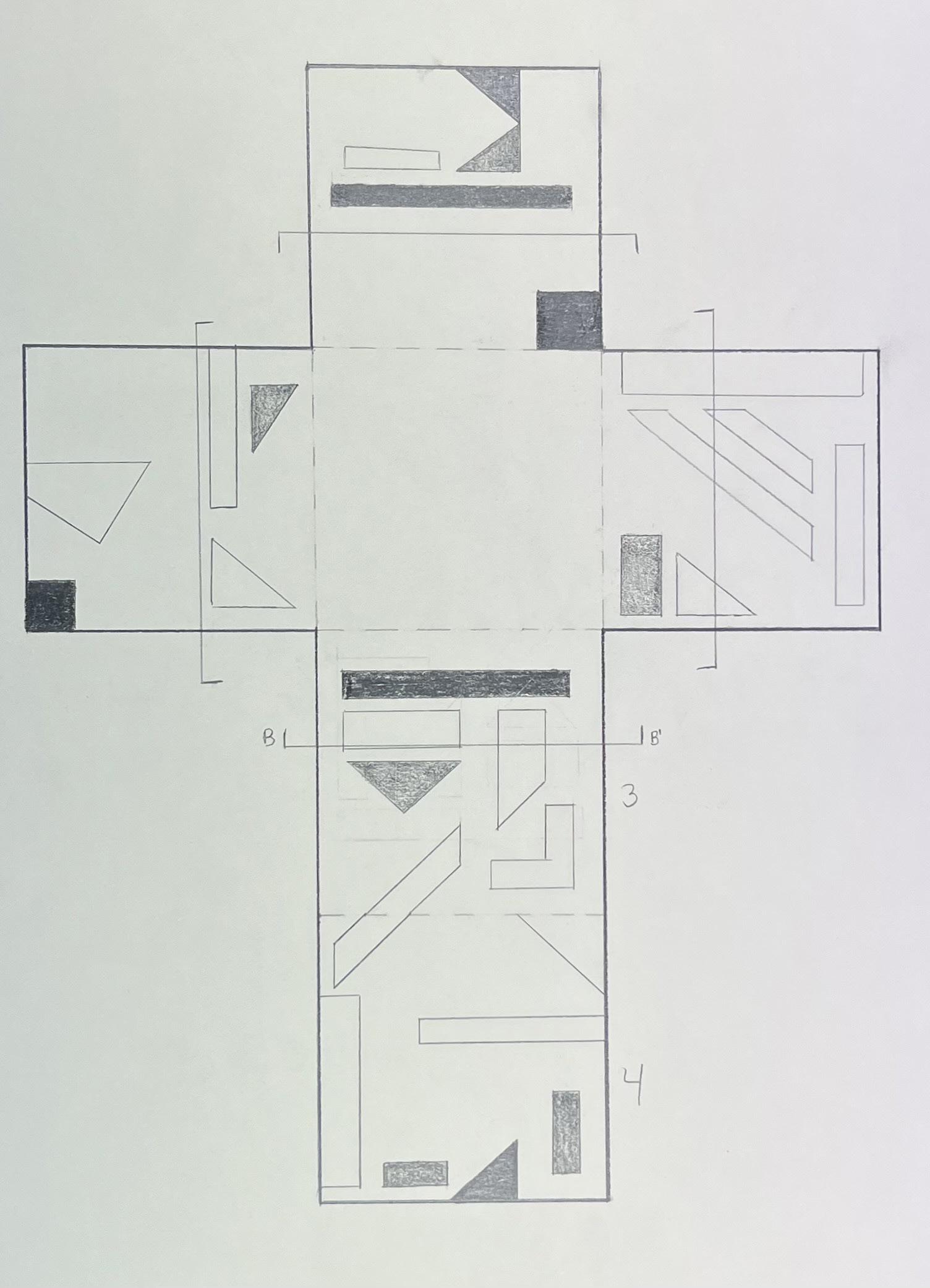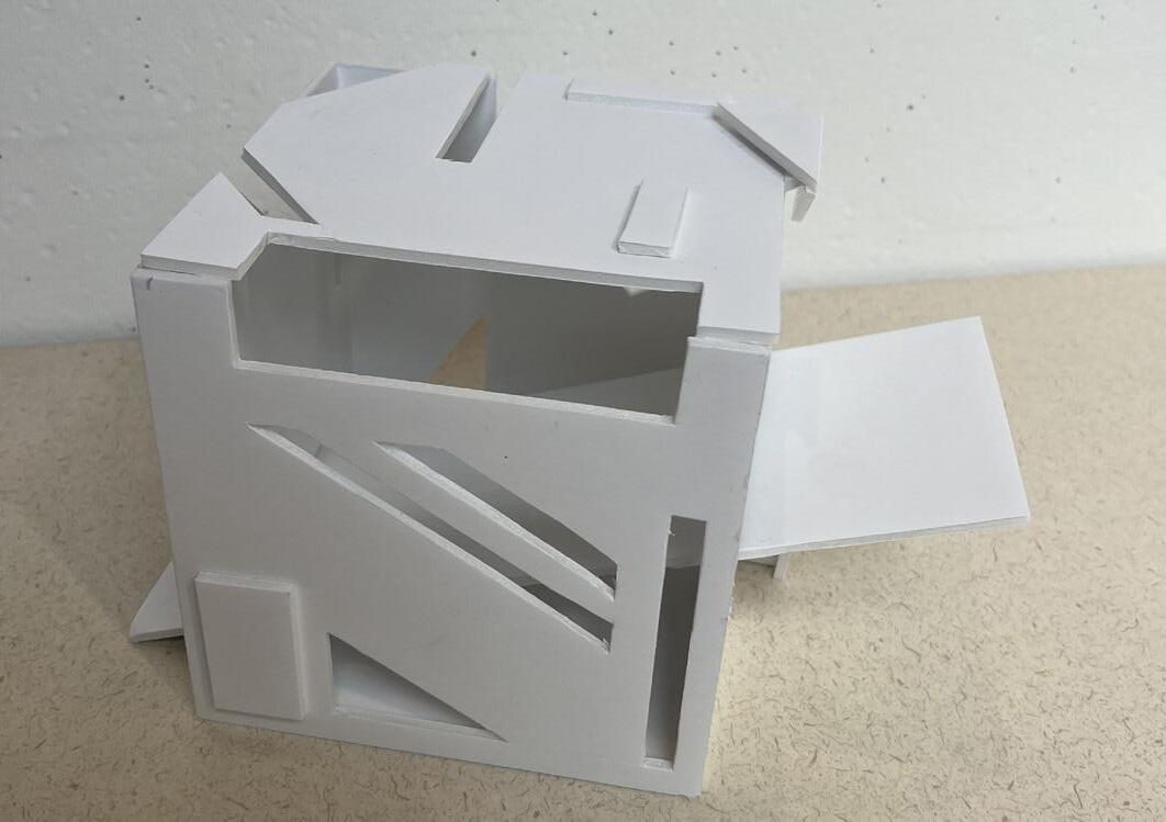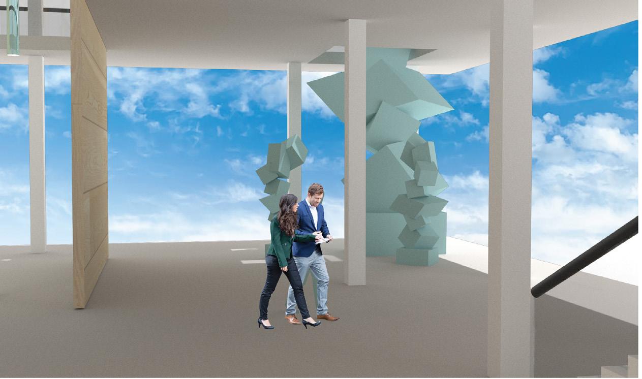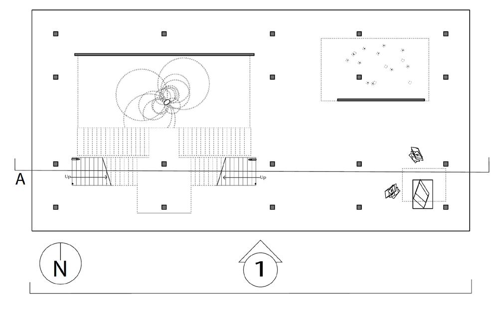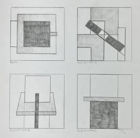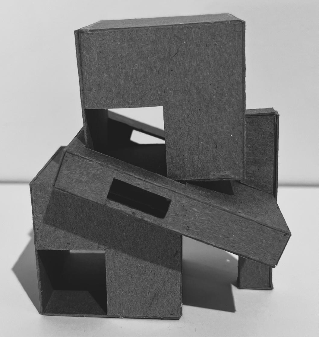 The instruction for this project was to design one space for a person to experience alone, another space for 8-10 people to experience. The design of this specific project was focused towards a mosaic glass artist with an area for a gallery, and an area for them to create their work. In the gallery, there is a feature ceiling with cascading beams, inspired by a previously studied precedent project. In addition, stairs lead the visitors from the exterior to interior of the gallery to allow them to see a different perspective of the artwork. Visitors can see the studio from the gallery through a procession of windows. An intention of this project was for there to be an experience at every stopping point. In various spots, visitors may see the artist’s work either in an overhanging plane or in the large overbearing wall. Stepping stone guide the circulation from one space into the next. To contrast with the sharp lines of the buildings and planes, circular apertures can be seen on the diagonal overhang of the studio space and an arched doorway into the gallery was added. The materiality of the space is neutral to provide emphasis and make the mosaic artwork the focal point.