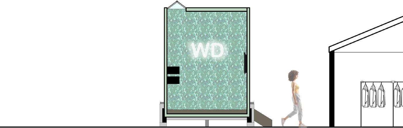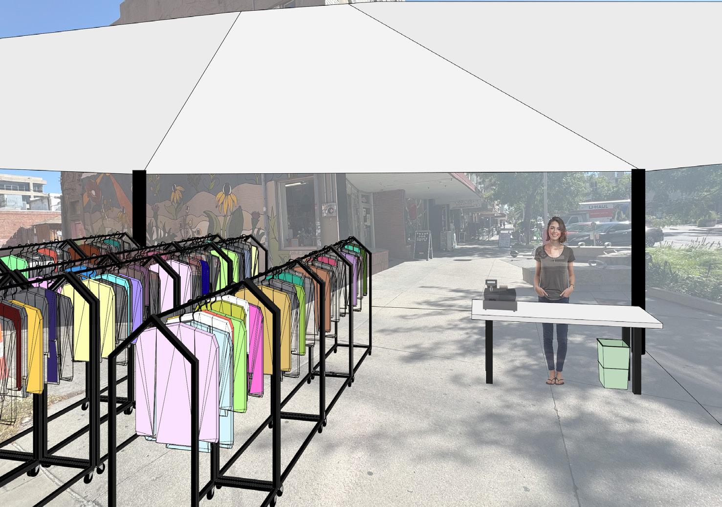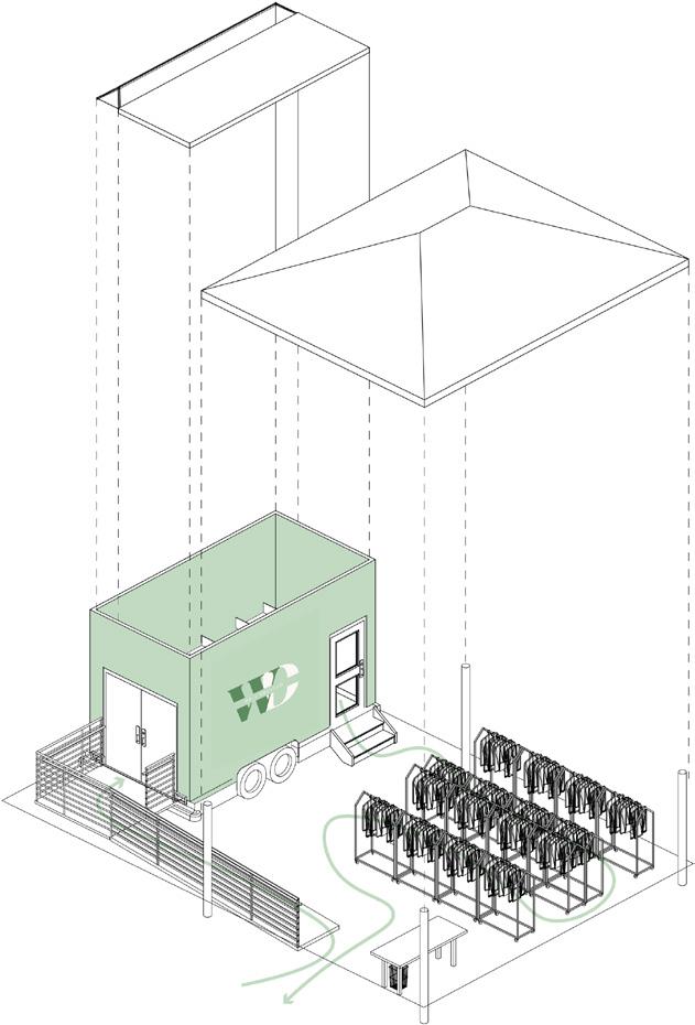 This mobile outreach service provides an opportunity for users to gain insight on the benefit of recycled clothing and then to make the decision to buy the clothing versus shopping at other boutiques. The site is right next to a popular boutique in Lincoln, Nebraska, hoping to persuade users to shop at this store and help the environment rather than to shop at the competitor’s store, which utilizes fast fashion. The circulation of the space drives users to first enter the trailer where they are educated and can discover the steps and benefits of recycled clothing. They are then driven to go shop through the recycled clothing where they can engage with the products and are provided service by the workers. The overall goal of this program is to reinforce stability and the environment while encouraging people to sway away from fast fashion and turn towards recycled clothing to help the wellness of the environment. The hope is for them to leave feeling educated, impacted, and content with their choice