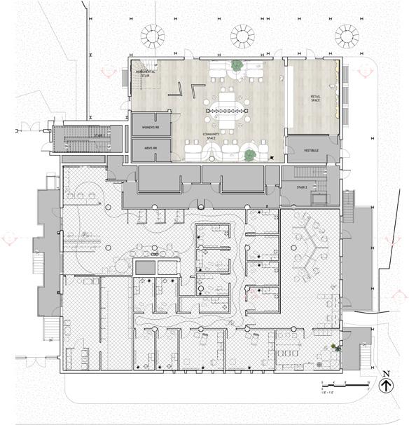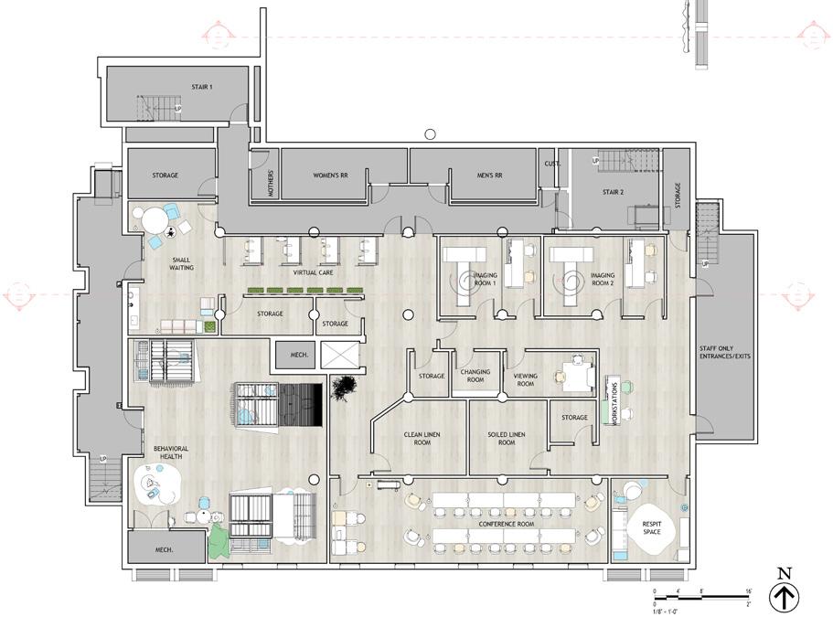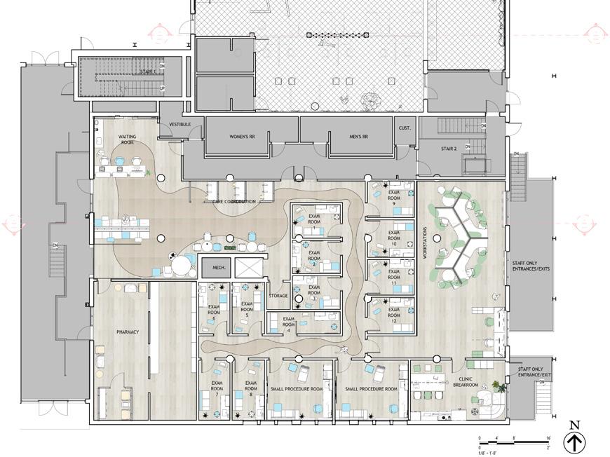 The inclusion of “wildcard” spaces provides a refreshing contrast to the conventional seriousness of healthcare, without compromising the clinic’s primary objectives. Inspired by extensive interviews with healthcare professionals, the behavioral health wildcard clinic re-imagines therapy, adding a dynamic layer of performance to the experience. Meanwhile, the community and retail spaces contribute a playful, wellness-oriented atmosphere, enriching the environment for all who interact with it. Overall, this thoughtfully designed clinic exemplifies how intentional spatial elements can transform healthcare environments, balancing functionality with creativity and wellness to enhance the experience and well-being of both patients and staff.