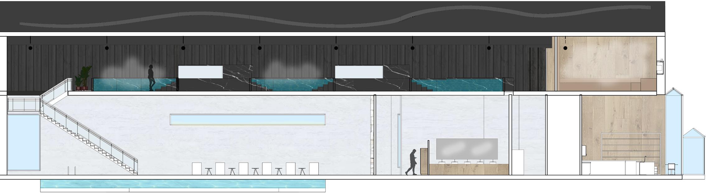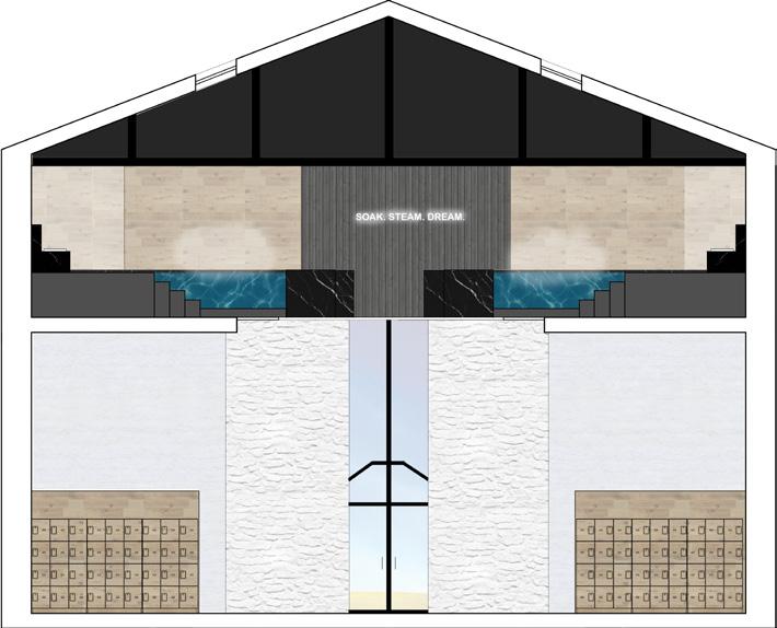 THE EX MATTATOIO IN ROME, A FORMERLY KNOWN SLAUGHTER HOUSE, WAS TRANSFORMED INTO A MODERN, PUBLIC BATHHOUSE FOR VISITORS TO SOAK, STEAM, AND DREAM. INSPIRED BY A COMBINATION OF HISTORICAL AND CONTEMPORARY PRECEDENTS, THIS BATHHOUSE USED CIRCULATION AND MATERIALS TO DRIVE THE DIRECTION OF VISITORS WITHOUT SPECIFIC STEPS. THE CURVED WALLS WERE INSPIRED BY A KOREAN BATHHOUSE TO MOTIVATE CIRCULATION. THROUGH APERTURE AND MATERIALS, THE BATHHOUSE CREATES PROGRAM WITH A WELCOMING, PUBLIC MAIN FLOOR, AND A MOODY, PRIVATE SECOND FLOOR.