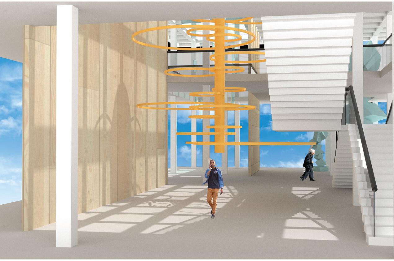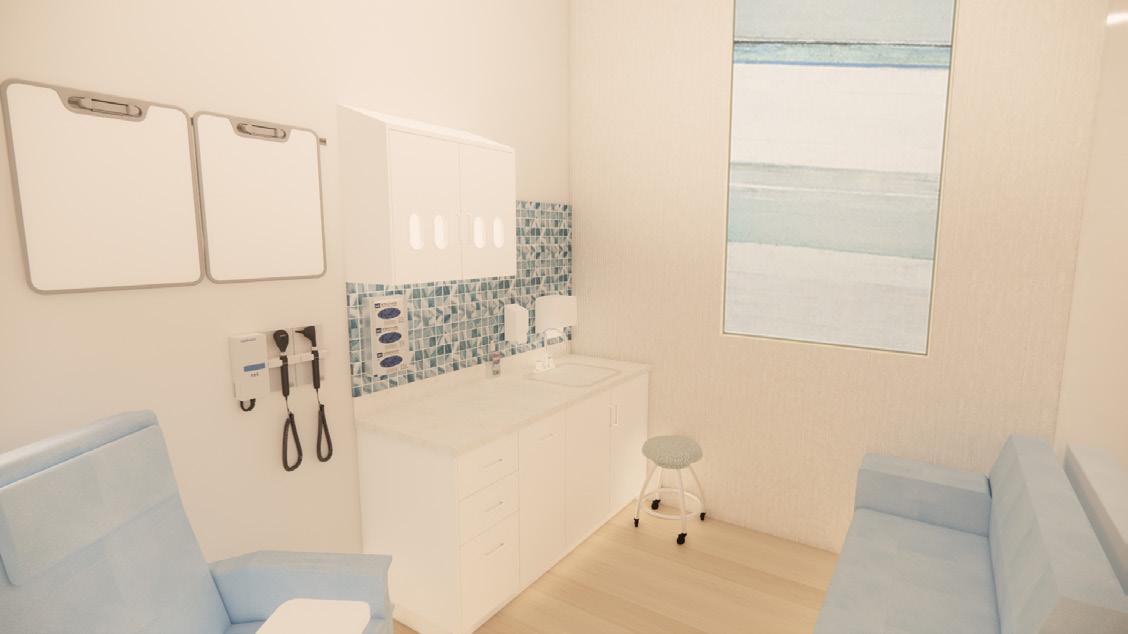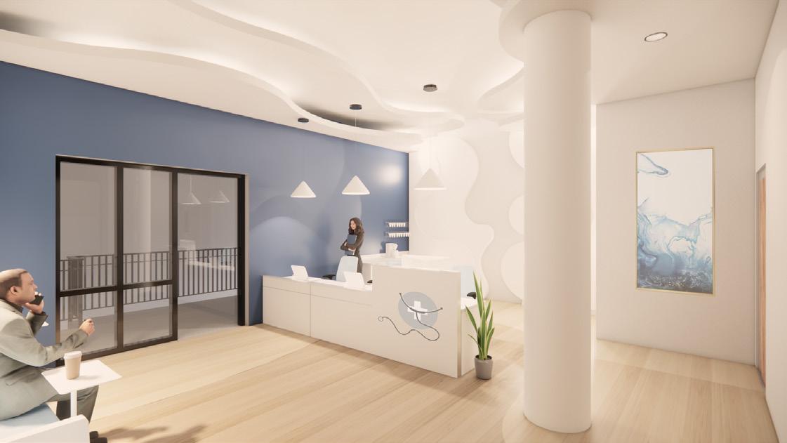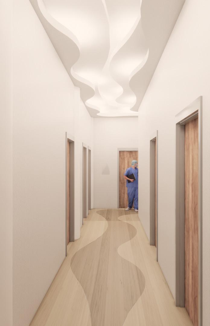 To create a healthcare space that fosters well-being, creativity, and positivity while addressing the needs of the users, patient comfort, psychology, and habits were considered when designing this space. This space influences users in an unconscious way through various implementations within the space, including color, spaceplanning, and shapes of elements. Each color was thoughtfully selected based on its emotional resonance: orange sparks creativity, blue promotes relaxation, and green fosters a connection to nature. This space also harmoniously blends organic shapes and patterns to introduce an element of lightheartedness into a traditionally serious environment. The design of the space ensures seamless circulation, subtly delineating public and private areas. Curved ceiling and flooring patterns enhance way-finding, guiding users intuitively through the clinic. These design elements aim to support users’ well-being in an indirect yet meaningful way, creating an environment that inspires comfort and positivity to fosters wellness.