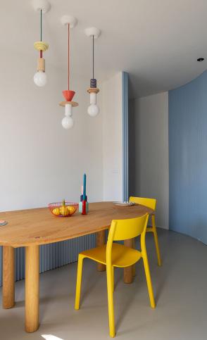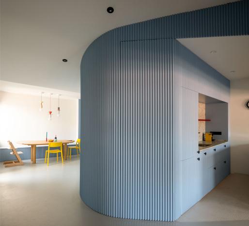 The Burgatoi Rennovation was designed for a young couple and their son with the key intention of creating a strong distinction between daytime (kitchen, dining, living) and nighttime (bed) space. It is a renovation of an original space. When the space was renovated, they changed the layout of the floor plan and removed multiple vertical elements to instead make a curved interior wall.
