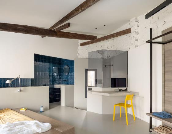 The design intention of the home was for the curve of the interior wall to mimic a smile. I found this to be one of the most interesting aspects of the home. Another interesting piece of the home is the layout of the bedroom. The bedroom and bathroom are all in one room unlike the typical bedroom/bathroom layout in America. Lastly, the color choices stood out to me because the vibrant colors contrast with the minimalistic furniture and modern designs. The home overall gives a calming but bubbly feel to its visitors. The Tenka Burgatoi Renovation is 1,184 square feet in comparison to the average size of 2,480 square