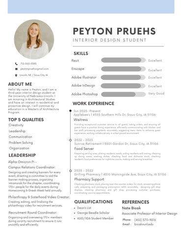 Hello! My name is Peyton, and I am a third-year interior design student at the University of Nebraska-Lincoln I am minoring in Architectural Studies and have an interest in residential and proactive design. I will continue my education in a Master’s of Architecture Program.