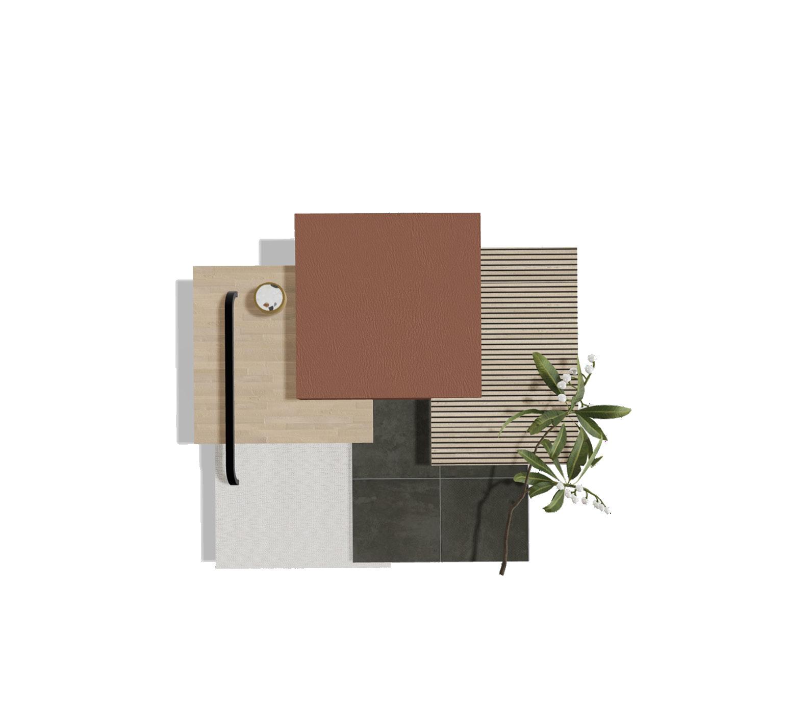 The orange and terracotta tones of the logo complement the interior material palette, creating a cohesive and harmonious design.