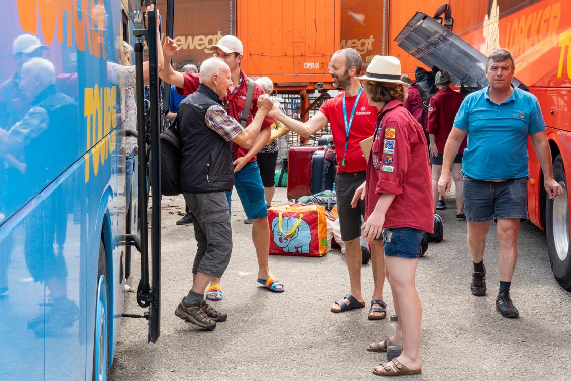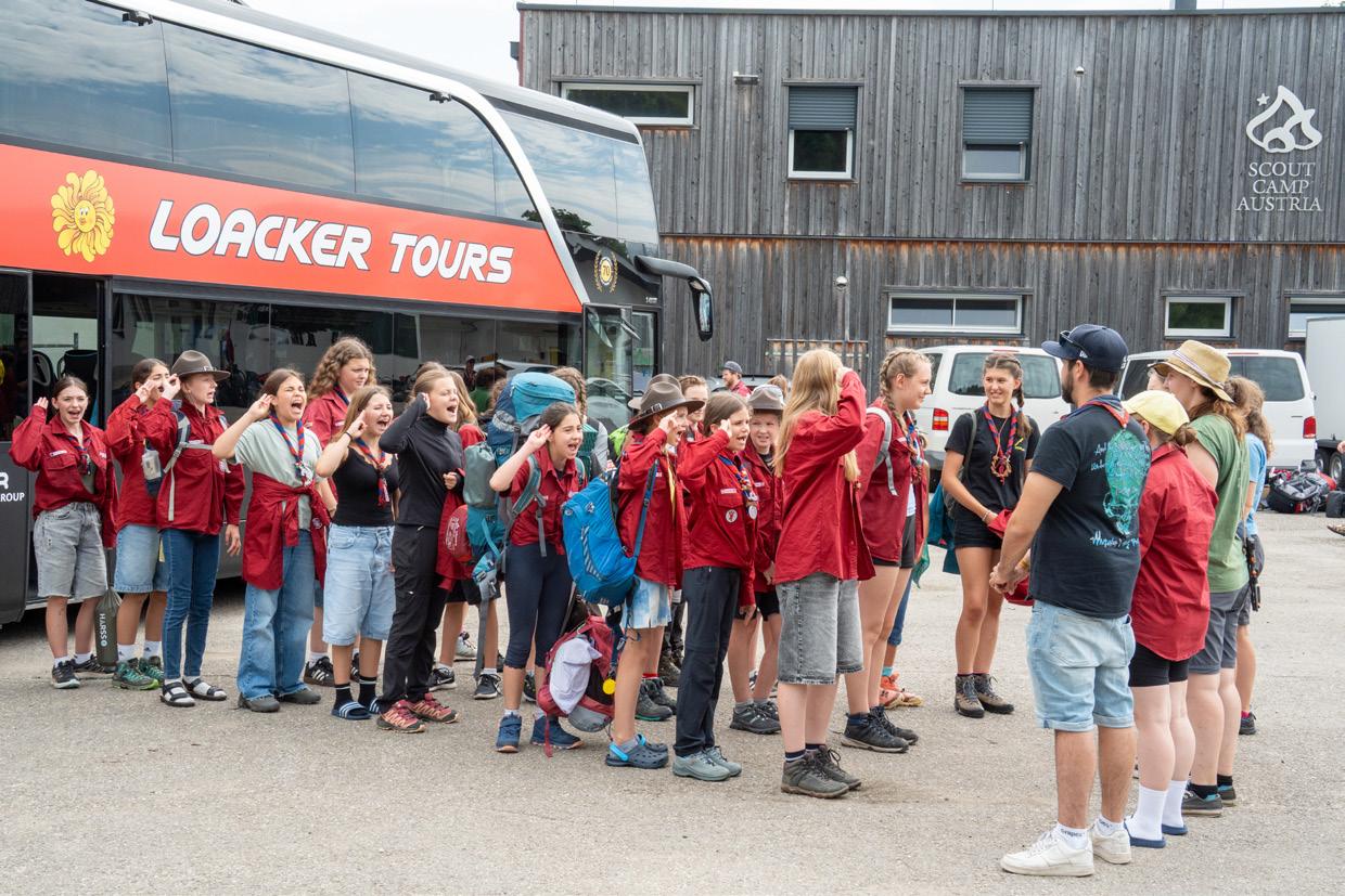 Am Sonntagmorgen versammel ten sich um 6.00 Uhr alle Pfadis in Rankweil. Vier voll besetzte Reisebusse kamen pünktlich um 11:30 Uhr beim Lagerplatz an. Nachdem die ersten Zelte aufgestellt waren, gab‘s eine Stärkung vom Küchenteam. Am Nachmittag sorgten einige Regentropfen für eine Abkühlung beim Aufbau der Lagerbau ten. Heute treffen sich alle um 15:30 Uhr zur großen Lagereröffnung!