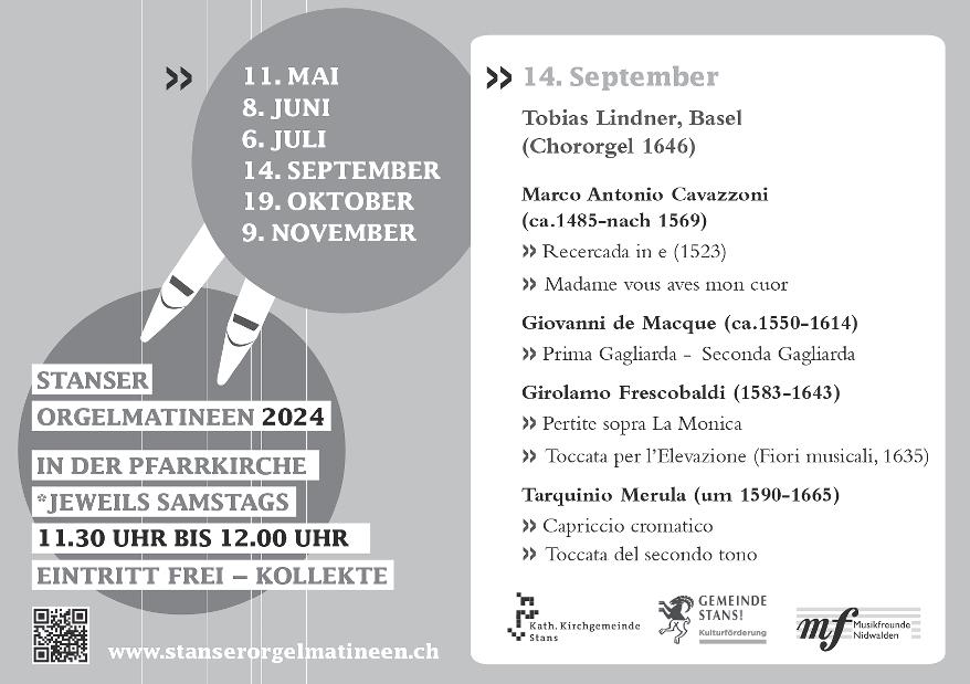 09.30 Gottesdienst – Dreissigster für Helena Josefina Simitz-Aschwanden, Bitzistrasse 1 C, Stans – 1. Jahresgedächtnis für Fini AbryGanz, Büntistrasse 8, Stans 11.30 Orgelmatinee