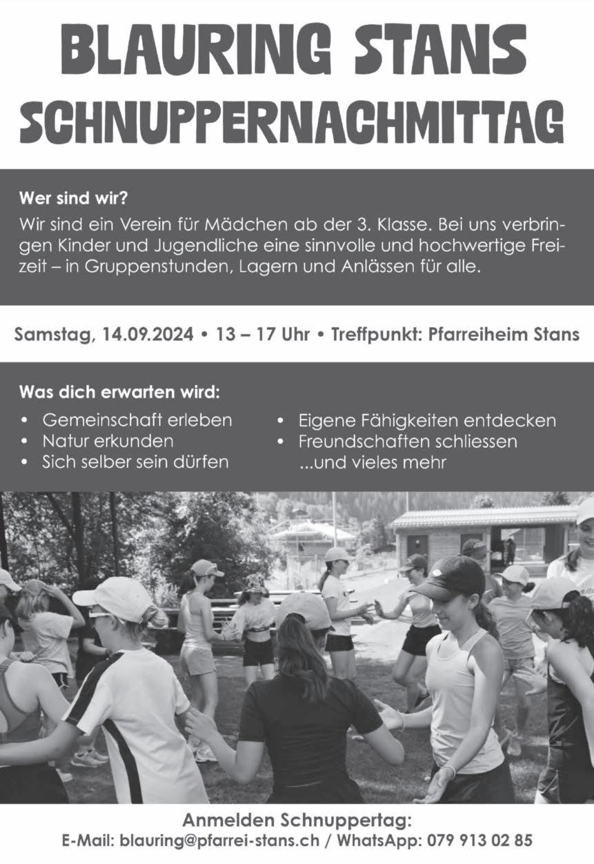 Samstag, 21. September, 12.00 Uhr, Speisesaal Heilpädagogische Schule, Stans 4-Gang-Menü und Getränk: Fr. 16.–Neuanmeldungen bis vier Tage vor dem Datum sowie Abmeldungen und Auskunft: Anna Maria Kälin, Tel. 041 610 43 53 Ursula Hüsler, Tel. 079 784 74 78