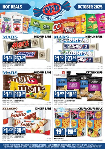 52 | Product Reference Guide NSW August 2022 F15 ICE 206061 5K ICE BAGS BELLS M73 INSECT AND SURFACE SPRAY 031748 250G(9) ODOURLESS FLY SPRAY MORTEIN 031747 300G(9) FAST KNOCKDOWN FLY SPRAY MORTEIN N94 MISCELLANEOUS - DRY 328681 1 LIFESAVER COUNTER UNIT LIFESAVERS 382680 1 LIFESAVERS DISPLAY TOWER LIFESAVERS 382679 1 LIFESAVERS DUMP BINS LIFESAVERS 029601 1.9K(6) MARASCHINO RED CHERRY STEM ON SANDHURST 079285 10(36) CREAM BULBS ISI 034609 100(10) WHITE APRON PLASTIC TEAR OFF CASTAWAY 191191 100(12) 15CM BAMBOO SKEWERS ALPEN 382394 1000 INDIVIDUALLY WRAPPED REFRESHER TOWLETTES BRIEMARPAK 098952 1000(10) WOODEN STIRRERS CASTAWAY 202502 1000(50) WRAPPED TOOTHPICKS ALPEN 243982 1PKX12(12) PLAYING CARDS QUEEN SLIPPER 274303 22PKX4 CRAWLER NAPPIES BABY LOVE 381641 250 RING SKEWER 12CM NATURAL ALPEN 279846 250(20) 12CM BAMBOO CURLY TOOTH PICK ALPEN 382530 250(20) 15CM BAMBOO PADDLE SKEWER ALPEN 258669 2K(2) QUINOA MIXED SANDHURST 384337 40MM REMOVABLE USE FIRST LABELS FILDES 284889 50 3PLY NON WOVEN FACE MASK TGA SAFETYCARE 103038 50(20) 11" OIL FILTERS ACE 093172 50(6) DARIOLE MOULDS NESTLE 202454 500(20) MEDIUM RARE STEAK MARKERS ALPEN 202501 500(20) MEDIUM STEAK MARKERS ALPEN 202455 500(20) MEDIUM WELLDONE STEAK MARKERS ALPEN 202456 500(20) RARE STEAK MARKERS ALPEN 202500 500(20) WELL DONE STEAK MARKERS ALPEN MISCELLANEOUS 090558 500X40MM FRIDAY LABELS DAYDOTS 090554 500X40MM MONDAY LABELS DAYDOTS 090559 500X40MM SATURDAY LABELS DAYDOTS 090553 500X40MM SUNDAY LABELS DAYDOTS 090557 500X40MM THURSDAY LABELS DAYDOTS 090555 500X40MM TUESDAY LABELS DAYDOTS 090556 500X40MM WEDNESDAY LABELS DAYDOTS 212754 50MLX6(8) AFRICA DEODORANT LYNX 256558 700ML(6) MARGARITA MIX MONIN 384077 80MMX80 THERMAL REGISTER ROLL PAK 283293 850G(6) TOMATO POWDER KNORR 243993 8PK(12) MEDIUM ZIG ZAG TOOTHBRUSH COLGATE 382382 946ML(12) TABASCO BLOODY MARY MIX TABASCO 270844 CALTEX START KIT KAY CHEMICALS 284595 LIFESAVER COUNTER UNIT LIFESAVERS 237875 POS0092 SMALL FORMAT TOWER DARRELL LEA Q10 WINES COOKING 032734 15L RED COOKING WINE ELEGRE 050043 15L TAWNY COOKING PORT ELEGRE 032733 15L WHITE COOKING WINE ELEGRE 202261 640ML(12) SHAOXING COOKING WINE OSHA Q23 STATIONERY 050035 2250X4(7) LABELS PREPSAFE 384224 47 X99MM DURABLE SHELF LIFE DAY OF WEEK TUESDAY FILDES 384221 47X99MM DURABLE SHELF LIFE DAY OF WEEK FRIDAY FILDES 384214 47X99MM DURABLE SHELF LIFE DAY OF WEEK MONDAY FILDES 384219 47X99MM DURABLE SHELF LIFE DAY OF WEEK SATURDAY FILDES 384220 47X99MM DURABLE SHELF LIFE DAY OF WEEK SUNDAY FILDES 384222 47X99MM DURABLE SHELF LIFE DAY OF WEEK THURSDAY FILDES 384223 47X99MM DURABLE SHELF LIFE DAY OF WEEK WEDNESDAY FILDES 270301 75MMX49 DISSOLVABLE PREP LABELS FILDES P58 SNACKS INCL SBA&PRINGLES 243809 134GX12 ORIGINAL CRISPS PRINGLES 381106 19GX24 HONEY SOY CHICKEN CRISPS NATURAL CHIP COM 255302 19GX24 SEA SALT CHIPS NATURAL CHIP COM 380810 42GX12 ORIGINAL PRINGLES PRINGLES 382158 42GX12 SOUR CREAM & ONION PRINGLES PRINGLES 270910 45GX18 CHICKEN HONEY SOY KETTLE 270944 45GX18 ORIGINAL SEA SALT KETTLE 246807 45GX18 SEA SALT & VINEGAR CRISPS KETTLE 243816 53GX12 ORIGINAL CRISPS PRINGLES 243814 53GX12 SALT & VINEGAR CRISPS PRINGLES 243815 53GX12 SOUR CREAM & ONION CRISPS PRINGLES 270909 90GX12 HONEY SOY CHICKEN KETTLE 270931 90GX12 NATURAL CHILLI CRISP KETTLE 241500 90GX12 SOUR CREAM SWEET CHILLI CRISP KETTLE P59 SNACK FOODS MISC 383868 100GX12 VEGE CRACKER BBQ PIRANHA 383867 100GX12 VEGE CRACKERS BALS VINEGAR & SEA SALT PIRANHA 383864 100GX14 SOY CRISPS ORIGINAL PIRANHA 706008 125G(6) ROSEMARY AND SEA SALT GRISSINI STICKS ALWAYS FRESH 383305 125GX10 PRETZEL BOWS EARTHS BOUNTY 031710 150G(6) THIN ORIGINAL RICE CAKES SUNRICE 274732 15GX200 PRETZELS EARTHS BOUNTY 279880 1K(5) PUMPKIN & GOATS CHEESE ARANCINI HERMANS 250758 200GX55 CRAB CHIPS SA GIANG 279581 230G(6) OREO MINI MULTIPACK OREO 259163 23GX100 MULTIGRAIN CRISPS ITAL/SUP PIRANHA 381394 23GX100 OREGANO THYME SOY MIX PIRANHA 383845 25GX24 SNAPS OREGANO & THYME PIRANHA 383846 25GX24 SNAPS SMOKEHOUSE BBQ PIRANHA 285389 3.3KX4 BLUEBERRY POPPING PEARLS REIPAK 383841 300GX14 CASHEW & SOY SNACK MIX SNACKSMART 382456 35GX21 DELICIOUS ENERGY MIX JC'S 382454 35GX21 DELICIOUS HEALTHY MIX JC'S 382457 35GX21 JACKAROO MIX JC'S 382455 35GX21 NATURAL AUSTRALIAN ALMONDS JC'S 282274 3K WONTON CRISPS POKED 211581 400G(12) POPPING CORN RIVIANA 279776 40GX12 BACON BITES NOBBYS 058512 40GX6(4) SNACKS THAT GO CLASSIC FRUIT & NUT MIX SUNBEAM 255363 45GX12 ORIGINAL STACKED POTATO CRISP THE GOOD CRISP C 383866 45GX24 VEGE CRACKER BALSAMIC VINEGAR & SEA SALT PIRANHA 383840 45GX24 VEGE CRACKER SWEET CHILLI LIME PIRANHA 382444 50GX10 PORK CRACKLE SALT & VINEGAR DON 382443 50GX10 PORK CRACKLE SEA SALT DON 382442 50GX10 PORK CRACKLE SMOKEY BACON DON 383455 50GX7 DUO CABANOSI AND CHEESE PRIMO 383457 50GX7 DUO MILD TWIGGY STICKS AND CHEESE PRIMO 383456 53GX7 TRIO OF CHEESE AND KABANA PRIMO 283061 60GX5 MINI RICE CAKES SALTED CARAMEL TABLE OF PLENTY 383842 75GX12 POTATO GRILLS BALSAMIC VINEGAR & SEASALT PIRANHA 383843 75GX12 POTATO GRILLS ROAST CHICKEN HERB SEASONIN PIRANHA 383863 75GX12 POTATO GRILLS SEA SALT PIRANHA 383862 80GX20 CASHEW MULTIGRN & SOY SNACK MIX L SALTED PIRANHA 381573 91GX64 PHILADELPHIA SOFT PRETZELS SNACK OUT FOODS 381506 95GX6 SALSA TO GO AND DORITOS OBELA P60 SMITHS SNACKFOODS 247806 114GX12 6PK CRINKLE ORIGINAL POTATO CHIPS SMITHS 206543 170GX12 CHEESE SUPREME CORN CHIPS DORITOS 107854 27GX21 ORIGINAL CRINKLE CUT POTATO CHIPS SMITHS 380440 35GX15 TOOBS ORIGINAL TOOBS 274799 45GX18 CHEESE SUPREME DORITOS 275415 45GX18 CHEETOS CHEESE & BACON BALLS SMITHS 274798 45GX18 CRINKLE CUT BBQ CHIPS SMITHS 274797 45GX18 CRINKLE CUT CHEESE & ONION CHIPS SMITHS 274796 45GX18 CRINKLE CUT CHICKEN CHIPS SMITHS 274795 45GX18 CRINKLE CUT ORIGINAL CHIPS SMITHS 274794 45GX18 CRINKLE CUT SALT & VINEGAR CHIPS SMITHS 254266 45GX24 CHICKEN TWISTIES SMITHS 241653 90GX12 CHEESE SUPREME CORN CHIP DORITOS 241650 90GX12 RRD HONEY SOY CHICKEN CHIPS SMITHS 241652 90GX12 RRD SALT VINEGAR POTATO CHIPS SMITHS 