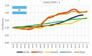 mo lapso de 2020 (+20 % en valor), volumen que representa el 25 % de la producción. Paralelamente se observa una recuperación del precio de la leche al productor. En el gráfico “Precios relativos que afectan el negocio en la Argentina” podemos ver la evolución de los precios relativos de insumos clave que impactan sobre la actividad de producción lechera en la Argentina, como son el maíz (termómetro de la cuenta Alimentación que se lleva más del 50 % de los costos directos), el gasoil (impacta aproximadamente en un 15 % sobre los costos de producción), el dólar (más del 70 % de los insumos de la actividad cotizan en esta