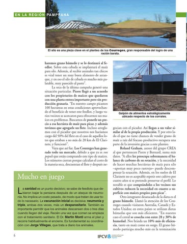 haremos grano húmedo y se lo destinará al feedlot. Sobre esta cebada se implantará el maíz para silo. Además, al recibir animales tan chicos es vital tener un muy buen alimento de arranque, y en eso el silo de cebada es mucho más palatable, muy parecido al pasto”. La seca de la última campaña generó una situación particular. Pierre llegó a un acuerdo con los propietarios de maíces que quedaron con una planta entera importante pero sin producción granaria. “En nuestro campo picamos 100 hectáreas en estas condiciones aprovechando el beneficio de tener este feedlot, y luego varios vecinos se acercaron para ofrecernos sus maíces en problemas. Buscamos de ponerle un precio a esa hectárea de maíz para picar, y además tuvimos que agregarle un flete. Incluso arreglamos con el picador que nosotros nos hacíamos cargo del 50% del flete en el caso de aquellos lotes que estaban a no más de 20 km de El Clarinete, y funcionó”. Vaya que así fue. Los Courreges han generado todo un mercado, debido a que ya es vox populi que están comprando este tipo de maíces. Los números cierran porque calculan el costo de la materia seca, descuentan el flete y después ne-