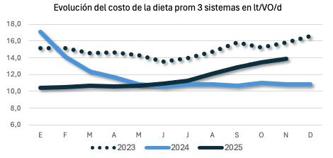 to cercano al 28% interanual. En el siguiente gráfico se observa la evolución del costo pro (pastoril, corral y estabulado) expresado en equivalente litros de leche diaria por vaca en ordeño. Los costos treparon y se ubicaron +3 litros/VO/d por sobre lo que costaba en octubre del año pasado.