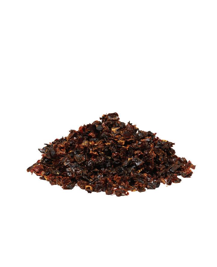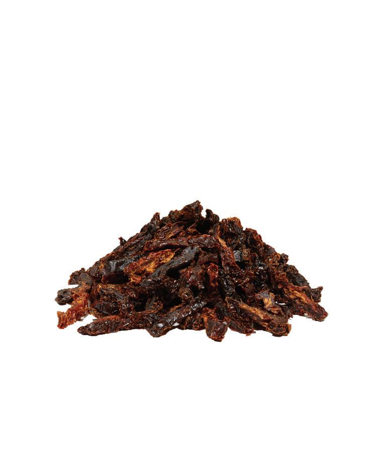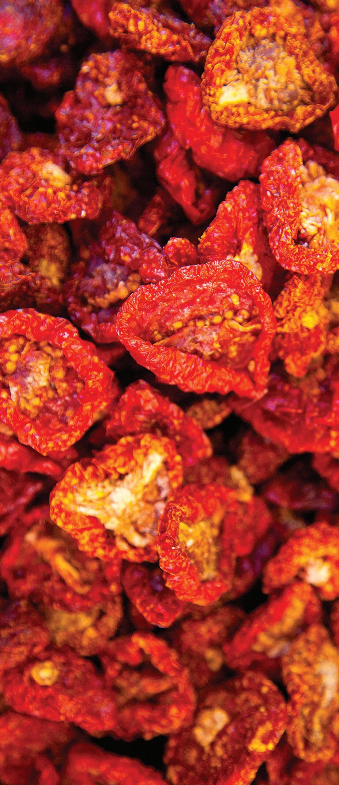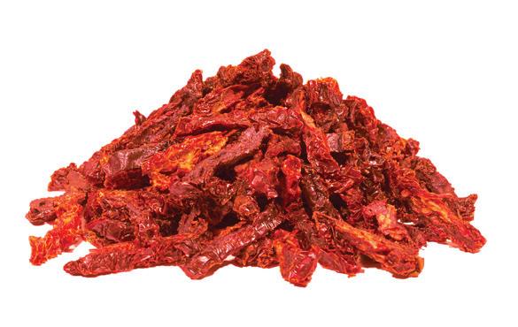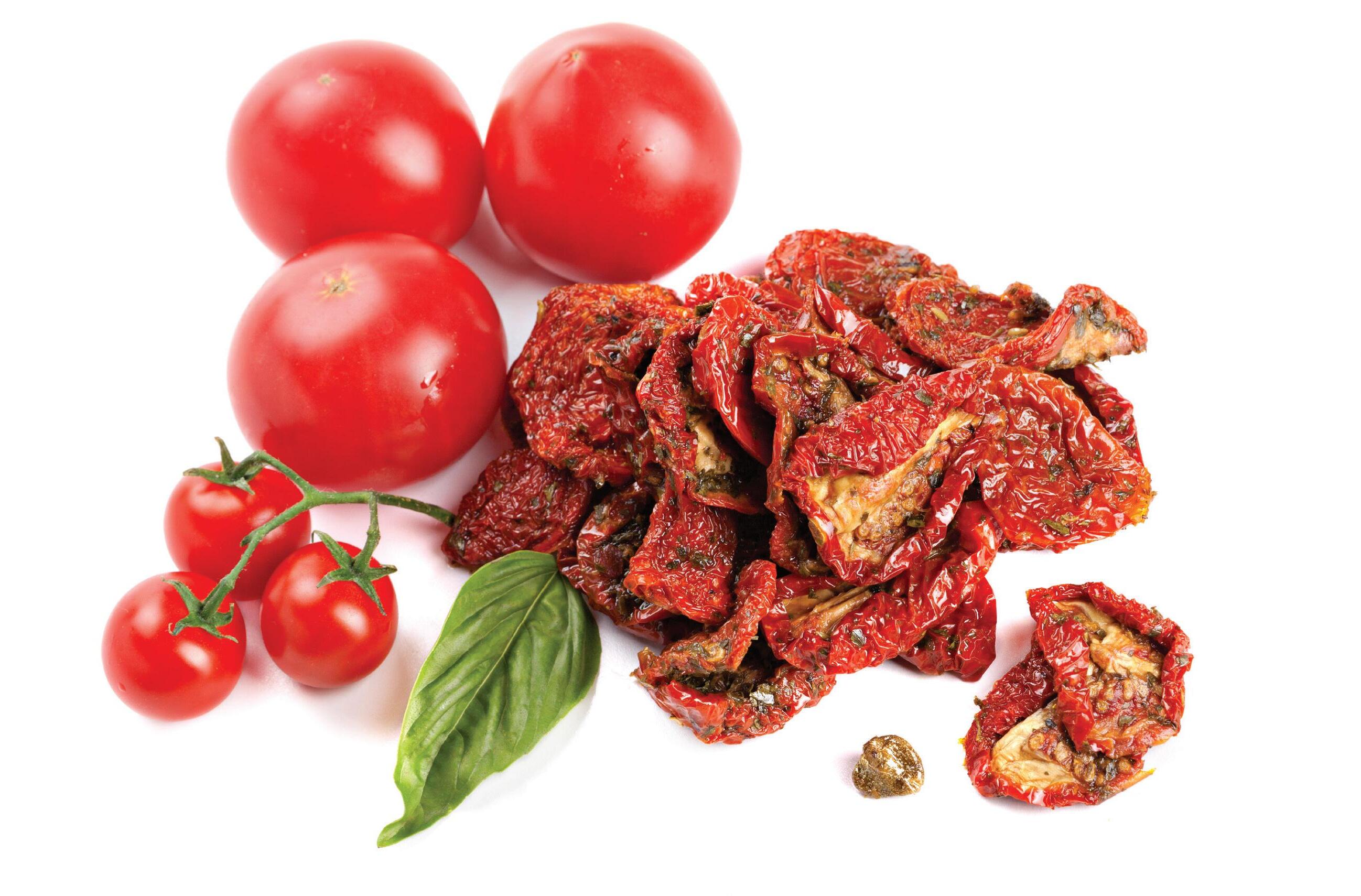 Fresh picked tomatoes are rinsed, sized, sliced, and placed on drying trays. This is followed by 1 to 2 weeks of drying, which reduces the moisture content of the tomato and provides pronounced tomato flavors.
