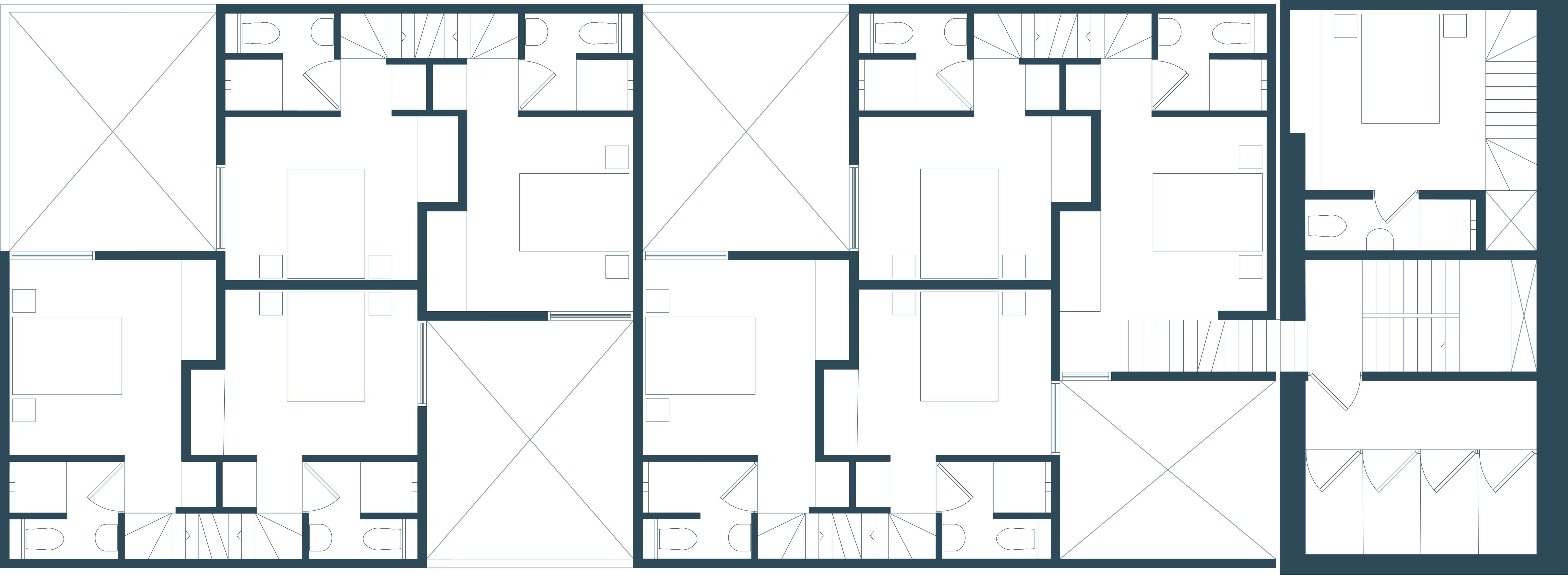 El tercer nivel cuenta con la misma distribución que el primer nivel, con la diferencia de que éstos departamentos cuentas con dos escaleras, por la derecha se baja a la habitación y por la izquierda se sube a su espacio privado/roof garden, donde se hace uso de la vegetación como barrera visual.
