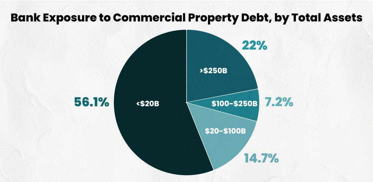 Banks with assets below $20 billion hold 56% of the commercial real estate property loans in the U.S. (See chart below courtesy of Visualcapitalist.com)