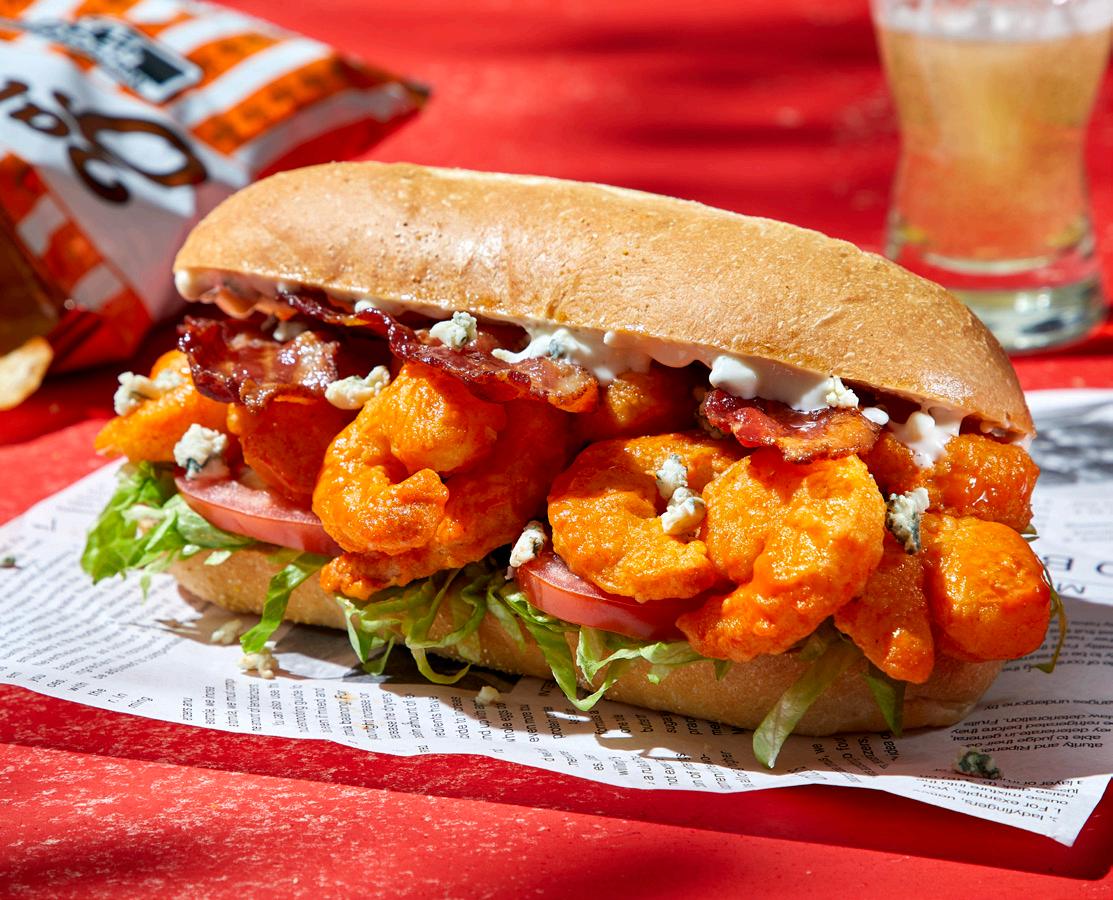 Heat oil in deep fryer to 350-degrees F. Cook shrimp for 2-3 minutes until golden brown, drain on a towel to remove excess grease. Toss shrimp in a bowl with wing sauce. Place lettuce on bottom of roll topped with sliced tomatoes followed by shrimp tossed inn wing sauce. Finish with some crumbles of blue cheese and blue cheese dressing on the side. Optional: Add crispy bacon for extra flavor. Enjoy!