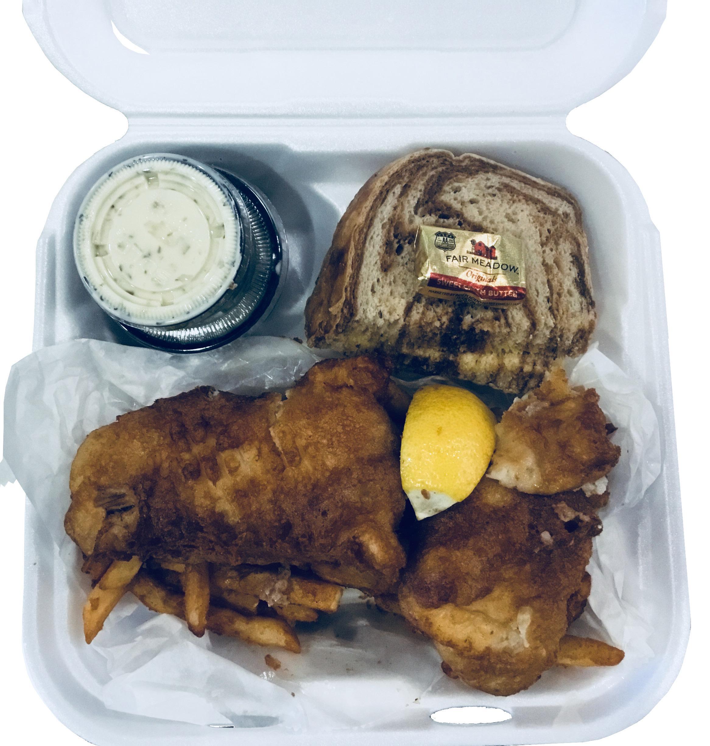 White plastic takeout bags can easily handle several takeout Fish Fry containers and handles make carrying to the car a cinch!